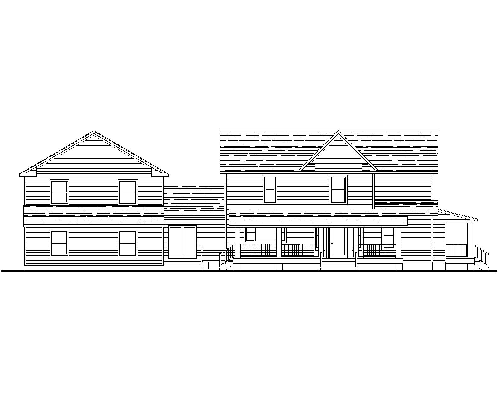 provide a photorealistic rendering of the side elevation of this house the siding color is rgba 136 149 155 the trim is white provide landscaping and one or two large trees bright sky