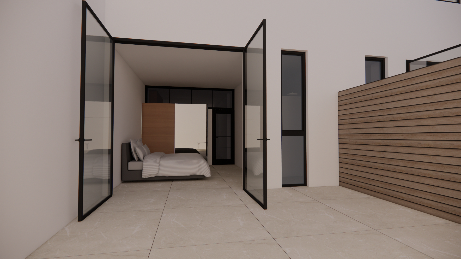 create a hyper realistic rendering with soft morning light through the doors interior shot of modern bedroom with doors opening up to yard with seating area and greenery the flat is in athens greece modern abstract artwork above bed colourful throw on bed modern linear pendants above nightstands hidden led lights on the ceiling all lights off tone should be relaxing and inviting