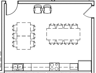 convert this floor plan into a realistic isometric 3d view of a full house show the space from an elevated angle with furniture walls and details visible kitchen space with light warm gray square flooring oak laminate cabinets dark countertops and commercial furniture chairs on south wall to be childrens high chairs use the same furniture as shows on the plan do not change the orientation of the floorplan