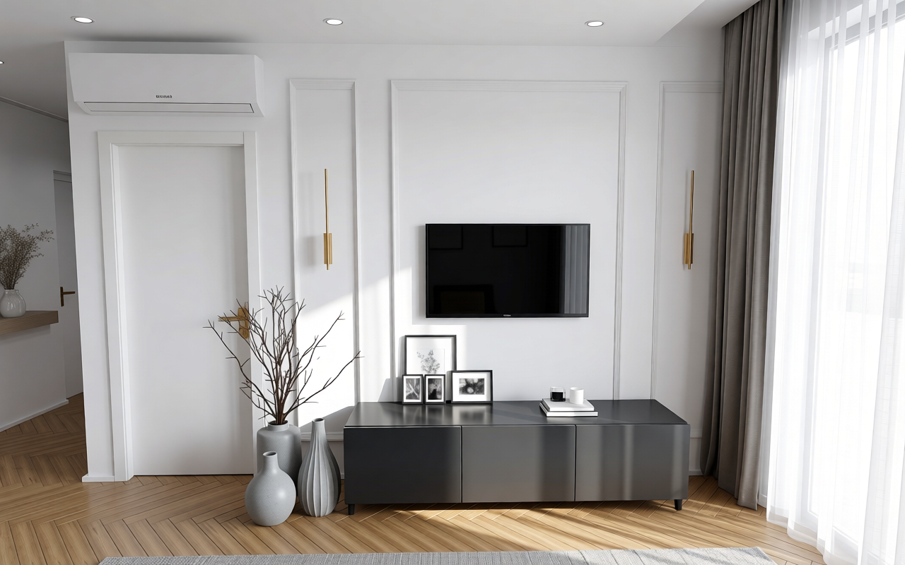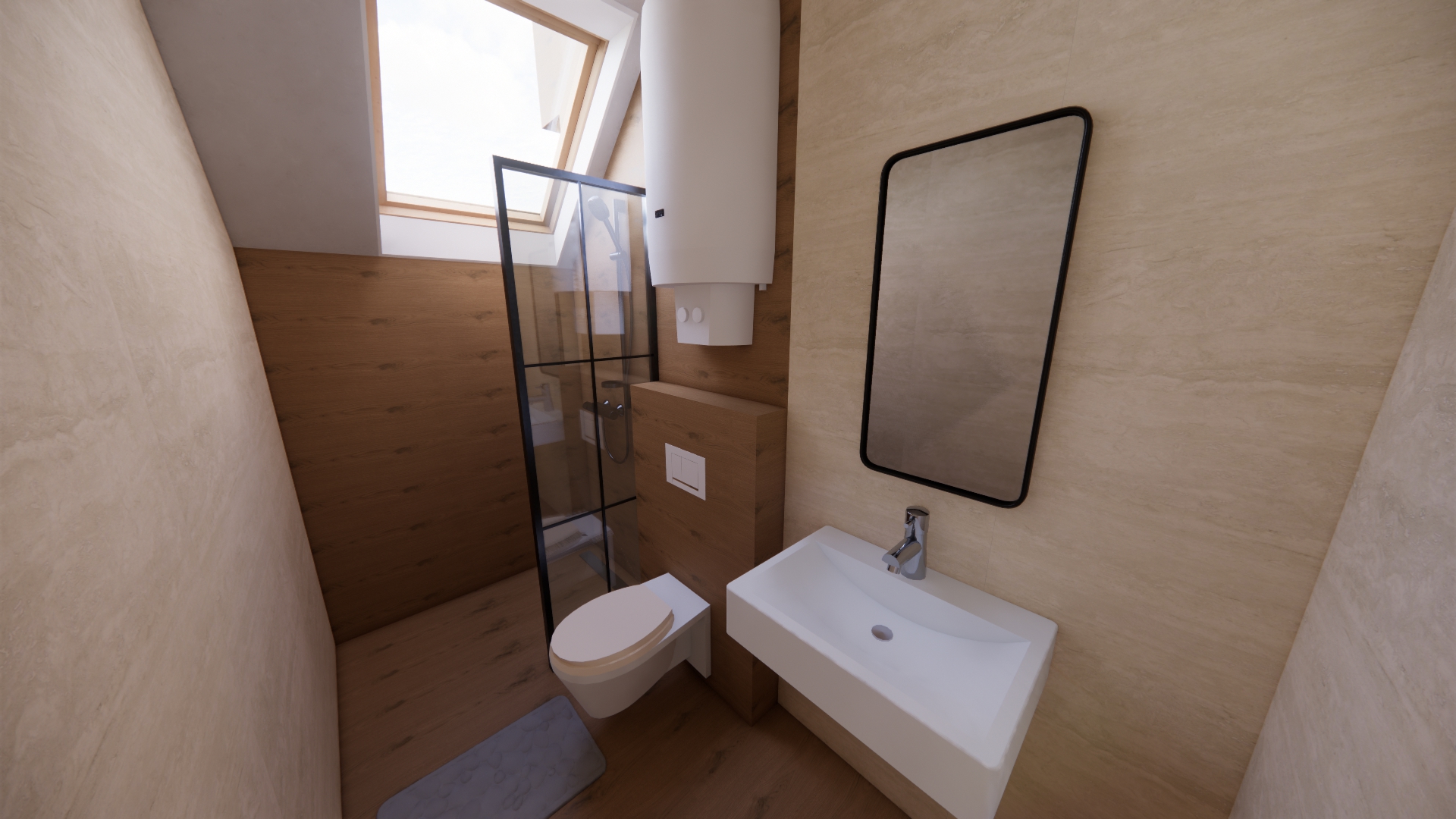 a beautifully rendered modern minimalist bathroom with a scandinavian design the walls are a soft beige stone texture complementing warm wood panels in light oak the ceiling is a crisp white enhancing the natural light pouring in through a skylight the shower features sleek black framed glass creating a striking contrast a white ceramic sink with a chrome faucet sits below an elegant black framed mirror the bathroom has a ceramic toilet and a compact water heater discreetly mounted above the floor is light wooden planks maintaining a cohesive and serene ambiance the atmosphere is calm and inviting embodying simplicity and elegance