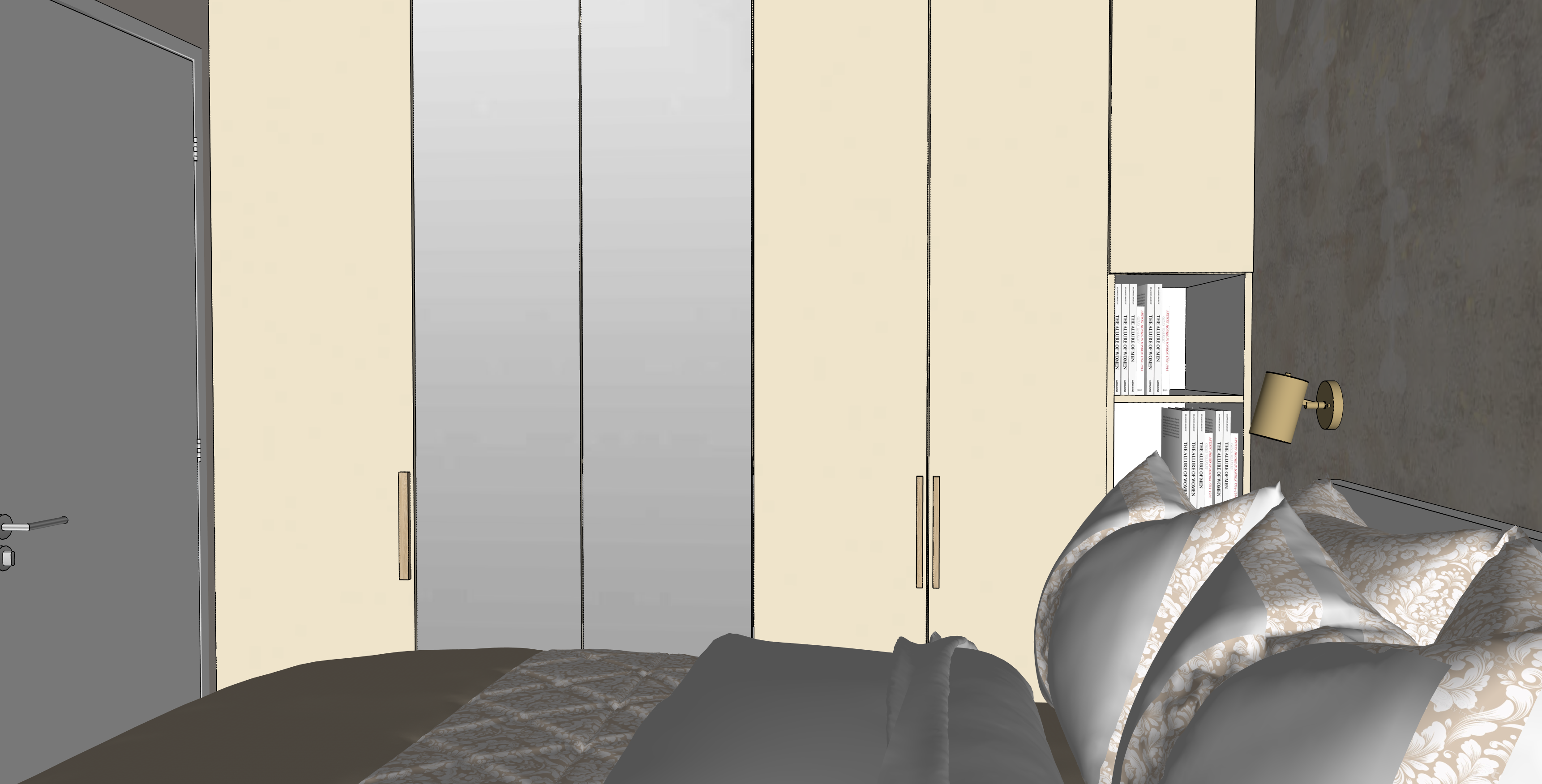 two doors of the wardrobe are mirror the rest are cream beige everything is clean
