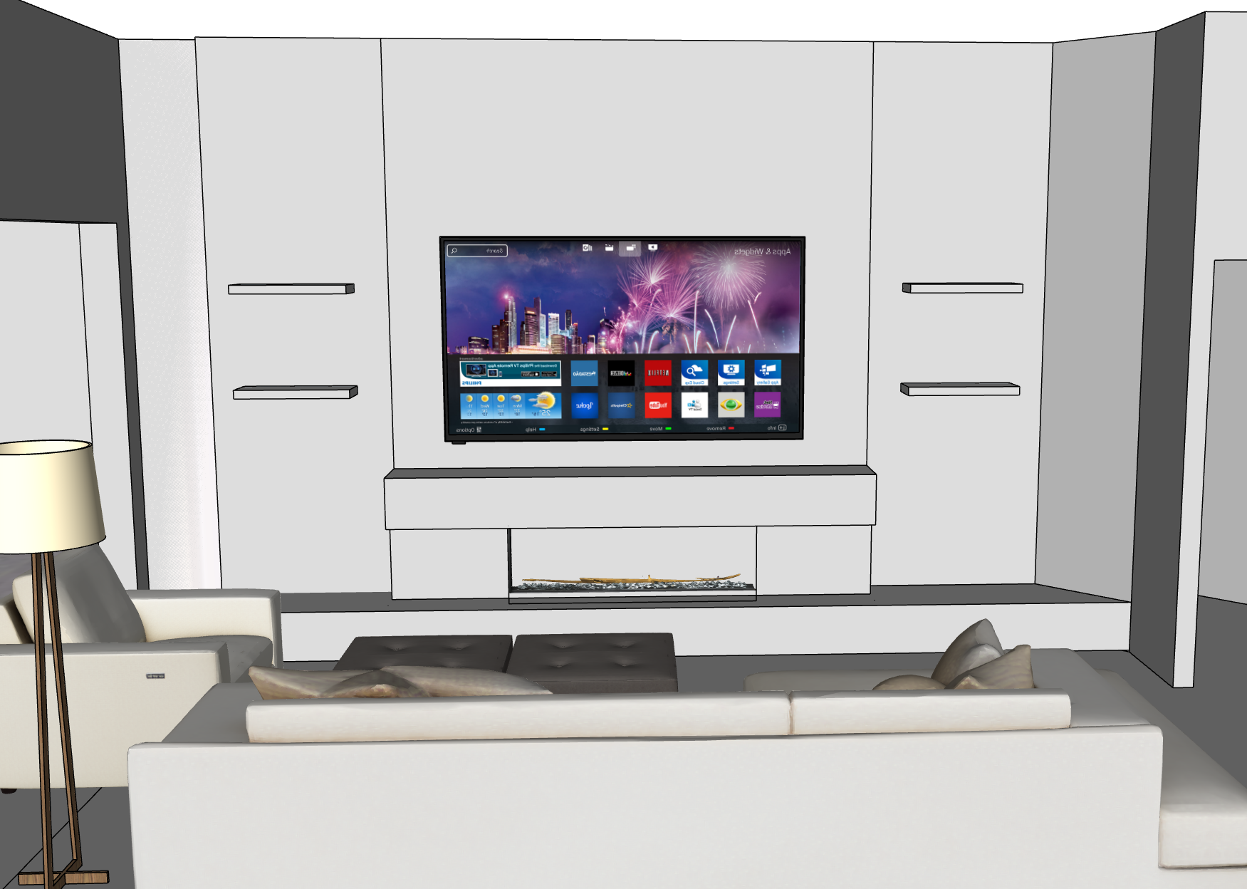 interior shot a luxurious and serene great room with a feature wall that has open sided glass electric fireplace surrounded by moasic stone with soft stone mantel top with soft wood base to mantel warm whites and taupe