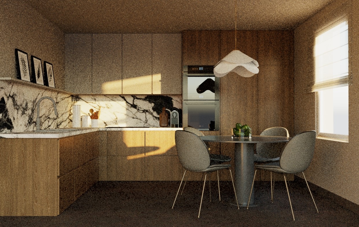hyperrealistic editorial refinement of an interior kitchen dining scene using the provided image as a strict base preserve the exact composition camera angle lighting direction and object placement remove heavy noise and grain while maintaining a subtle natural film like texture the image should feel clean but not artificial lighting warm late afternoon natural sunlight entering from the right window casting soft but defined shadows across the kitchen maintain the existing light direction and sun patches but soften contrast slightly and reduce burnt highlights keep a gentle atmospheric haze to enhance depth floor large format rectified porcelain tiles with microcement effect matte finish with slight tonal variation and minimal visible joints avoid uniform flat shading kitchen cabinetry natural walnut wood with vertical grain enhance realism by introducing subtle variation pores and micro imperfections avoid overly smooth or plastic appearance upper cabinets and shelf very light grey almost white perfectly integrated with the wall color matte finish countertop and backsplash marble effect porcelain matte and slightly rough surface reduce excessive contrast and shine veins should feel natural and soft not glossy or polished faucet brushed stainless steel with soft diffused reflections left floating shelf maintain three square black framed artworks aligned as in the original countertop objects two tall white porcelain containers and one utensil holder with wooden tools two wooden cutting boards placed vertically nespresso coffee machine in grey and black clearly defined dining table brushed stainless steel base with controlled reflections chairs upholstered in dark grey fabric with visible textile grain on the table transparent cylindrical glass bowl with pears natural light refraction and soft reflections pendant lamp papier m ch cart n piedra organic shape with visible rough and fibrous texture matte handcrafted look window blind semi opaque white linen allowing filtered light to pass through soft fabric texture slightly translucent overall look clean balanced editorial realism preserve warmth and atmosphere but eliminate render noise and artifacts materials must feel tactile and believable very subtle depth of field mostly sharp image with slight natural softness no changes in layout proportions or elements