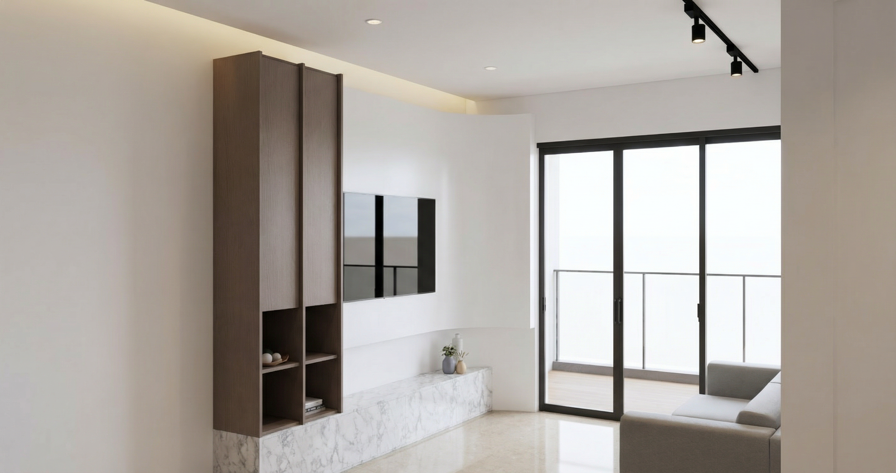 timber surround floating from floor clouds inside wall of skylight above light cream tiles floors