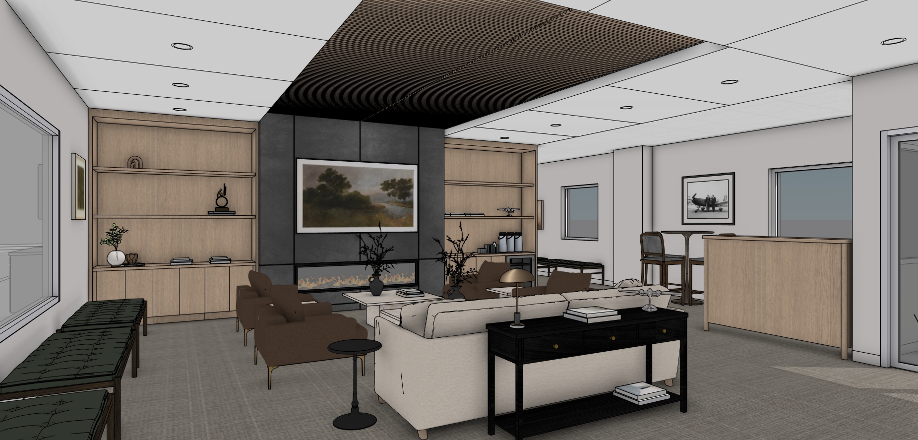 a luxurious and serene lounge with soft beige fabric sofa brown fabric chairs moss gree velvet benches soft gray carpet natural steel fireplace surround natural marble coffee tables black metal end tables warm natural white oak wood millwork along fireplace wall accented by elegant brass hardware the atmosphere is calm and inviting with abundant natural light filtering through the windows on the right casting gentle shadows window on the left looks into an enclosed private aiplane hanger garage windows on the right letting in natural light with view to parking and landscape