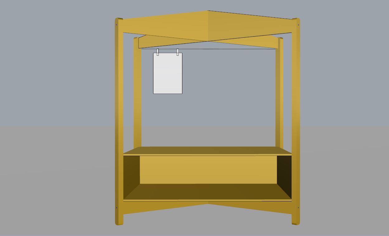 create a photorealistic architectural visualization from the provided base image of a retail kiosk the geometry proportions and shape of the kiosk must remain strictly identical to the reference image do not modify redesign simplify or reinterpret the structure only add materials lighting environment people and products environment place the kiosk inside a modern european shopping mall interior inspired by aupark environment characteristics contemporary shopping mall atrium polished stone or terrazzo floor glass railings and shopfronts in the background neutral interior tones white light grey beige diffused daylight from skylights combined with soft mall lighting the environment should look realistic but not overcrowded material specification critical the kiosk should be visually unified in one yellow color palette but materials must be strictly separated vertical prisms only these elements only the vertical prism elements of the kiosk are made of wood material stained beech wood appearance yellow stained tone visible natural wood grain matte or satin finish natural wood texture clearly readable important rule wood material must appear only on the vertical prisms all other kiosk surfaces all remaining parts of the kiosk must be made from material colored mdf board valchromat appearance yellow tone matching the stained wood matte finish subtle valchromat fiber texture important rule no wood texture is allowed on these surfaces these surfaces must clearly read as colored mdf panels storage space under the counter under the counter there is a storage space for products exactly as visible in the reference image rules the storage area must remain exactly as in the base image do not change its geometry size or position it should function as a practical storage zone inside the storage area place a small amount of merchandise or packaged craft products neatly arranged but realistic product display the kiosk sells handmade craft products display guidelines minimal amount of products curated selection clean and simple presentation focus should remain on the architecture of the kiosk signage sign material white pvc board installation suspended from thin steel cables appearance minimal and clean lightweight modern sign people add 2 4 people around the kiosk casually dressed shoppers natural relaxed poses possibly one seller behind the counter subtle interaction with the products people help communicate scale and realism lighting lighting should replicate realistic shopping mall conditions soft overhead lighting diffused daylight from skylights natural soft shadows warm neutral color temperature subtle reflections on the floor avoid dramatic cinematic lighting camera architectural photography style eye level camera slight wide angle approx 28 35 mm kiosk clearly visible and dominant in the composition realistic spatial depth rendering style highly photorealistic architectural visualization physically accurate materials realistic reflections and shadows subtle imperfections for realism critical constraints do not modify the kiosk shape do not change proportions do not redesign elements do not remove or modify the storage space wood material only on vertical prisms all other surfaces must be valchromat colored mdf