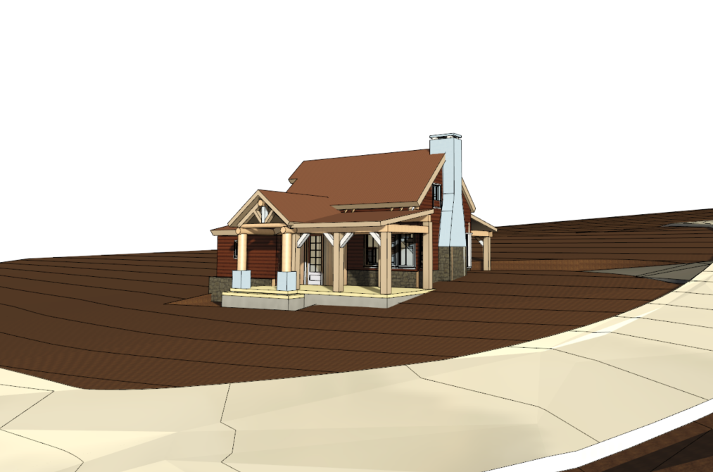 rustic colorado mountain cottage set in durango rendered in editorial architectural style the architecture must remain exactly as in the reference 3d model no changes to form proportions materials or detailing high quality hero render ultra realistic golden soft morning light gentle atmospheric haze subtle smoke drifting from the chimney surrounded by pine forest rocky terrain and distant snow capped peaks textures weathered timber siding stone base patinated metal roofing warm interior glow camera wide architectural perspective low angle perfect verticals soft realistic shadows mood cinematic calm mountain quiet rendering hyperrealistic natural color grading premium editorial finish scenery wild grasses scattered rocks dirt path leading to entry no people overall refined rustic luxury accurate to the reference model