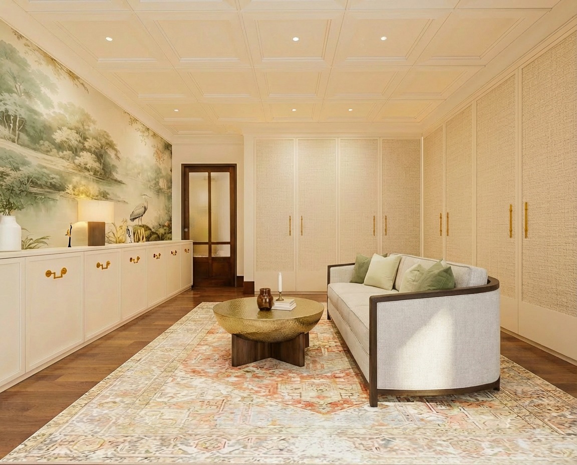 change carpentry color to walnut wood color with fabric wallpaper inlay