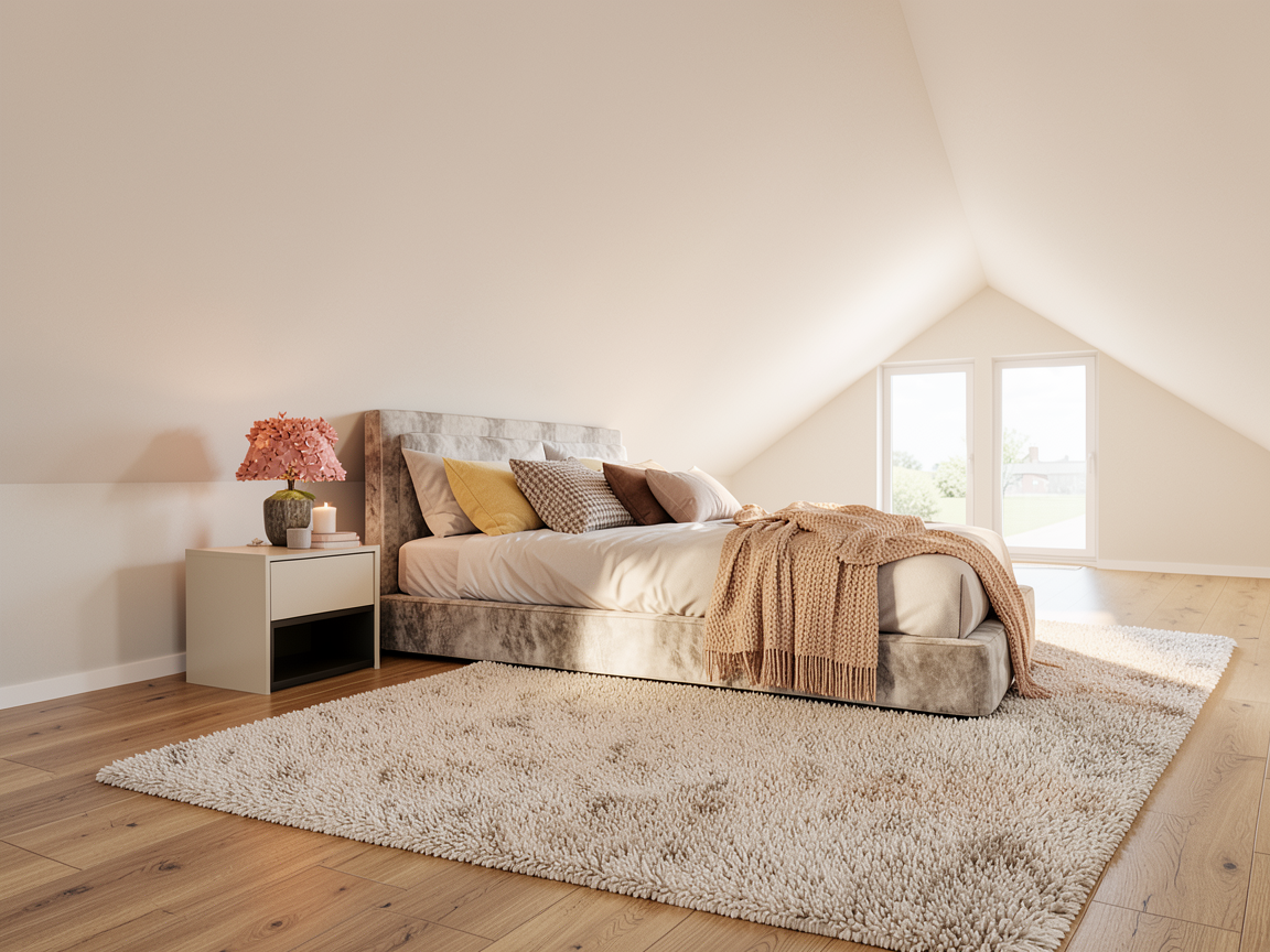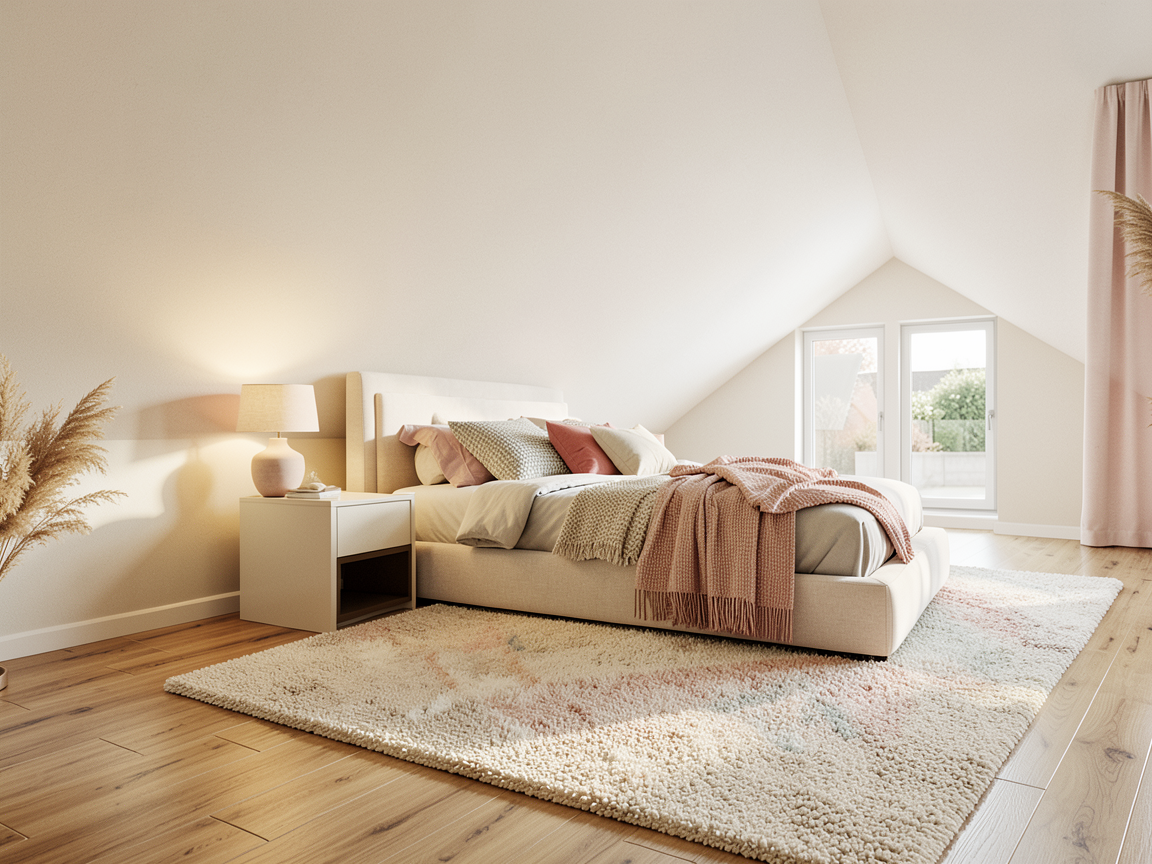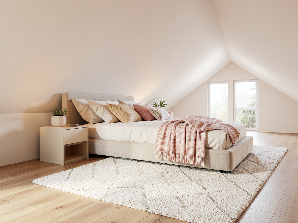 crea una imagen fotorrealista a partir de este sketchup a ade cortinas blancas translucidas en la zona de ventana manten colores y realza las texturas