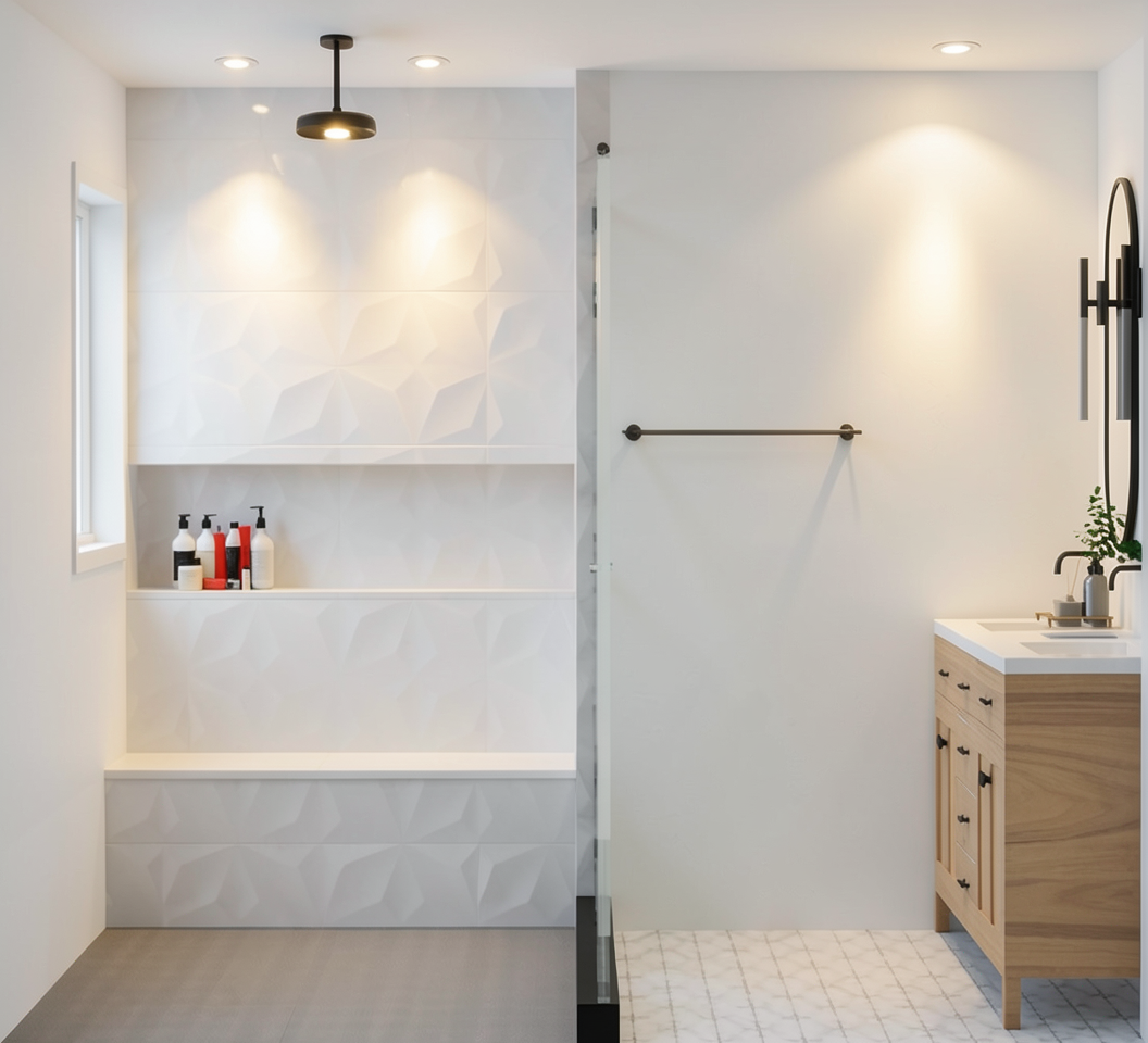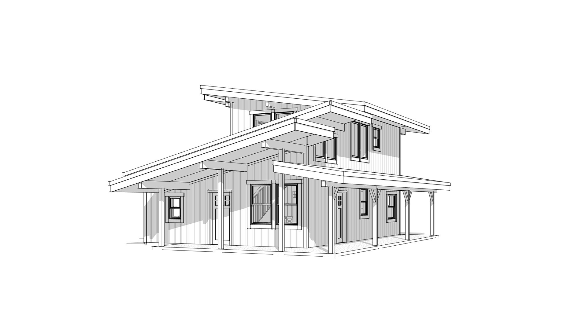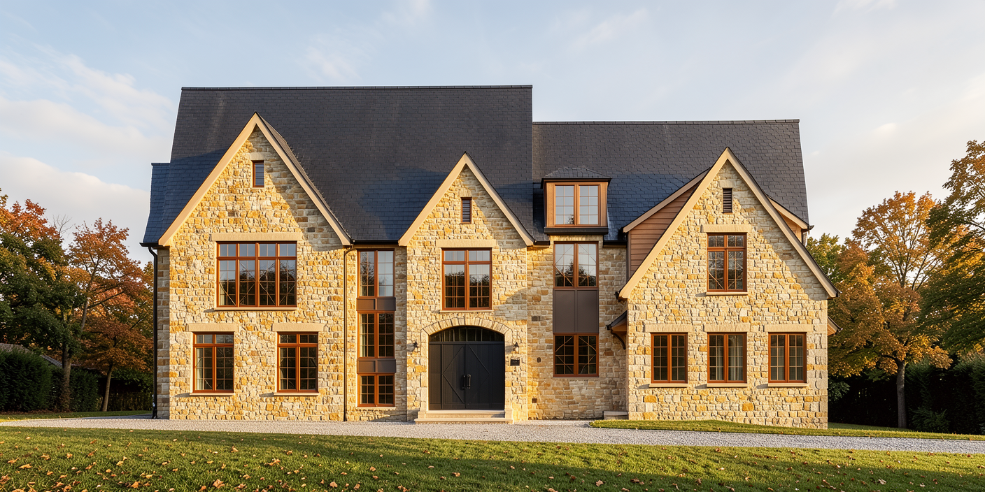 clean modern cabin architectural exterior home rendered in cinematic vibrant daytime lighting with blue skies and sparse clouds in the sky warm glow and reflections off of the windows rustic select grade wood cedar siding green manicured landscape around structure with hedges and gardens and patches of grass concrete driveway leading up to the cabin black standing seam metal roof prominent cinematic forest with big fir trees and ferns and moss surrounding behind the house in the background high fidelity photorealistic visualization crisp shadow falloff refined facade geometry soft atmospheric depth premium architectural photography mood ultra clean composition and materials dark trim around windows light stone columns