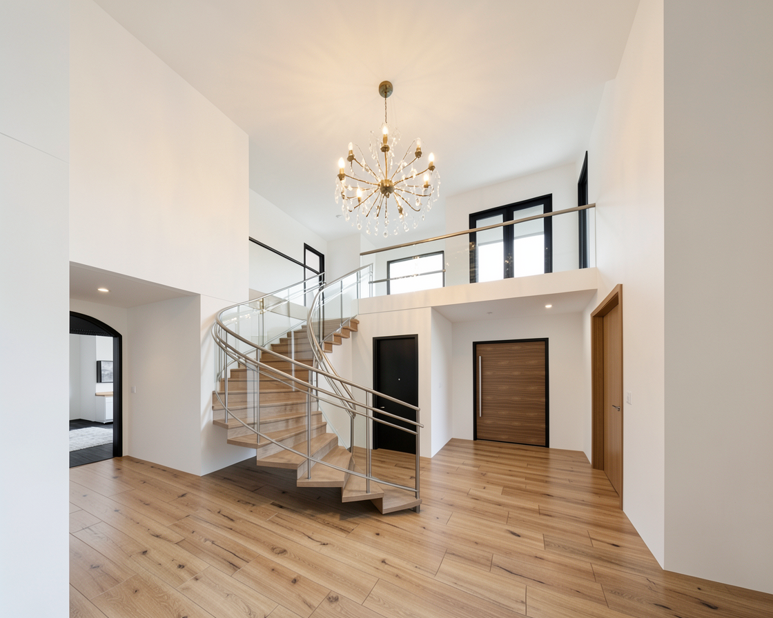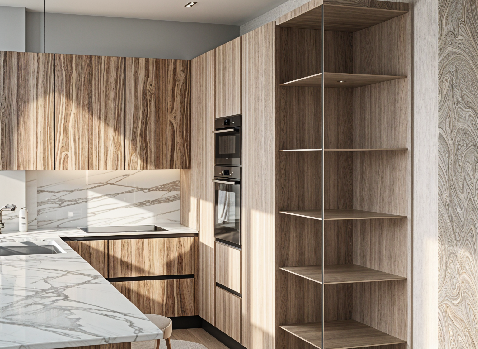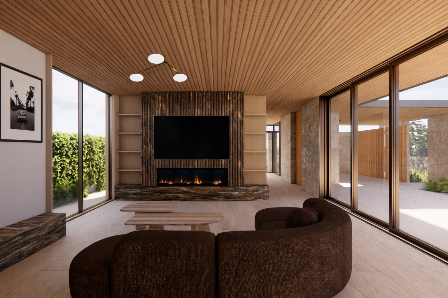 transform into a high end hyper realistic visualisation keep the view the same same walls same window same non reflective cream stone floors add detailed textures and reflections add textured jute rug under coffee table add a few design ornaments like vases and sculptures to the shelves