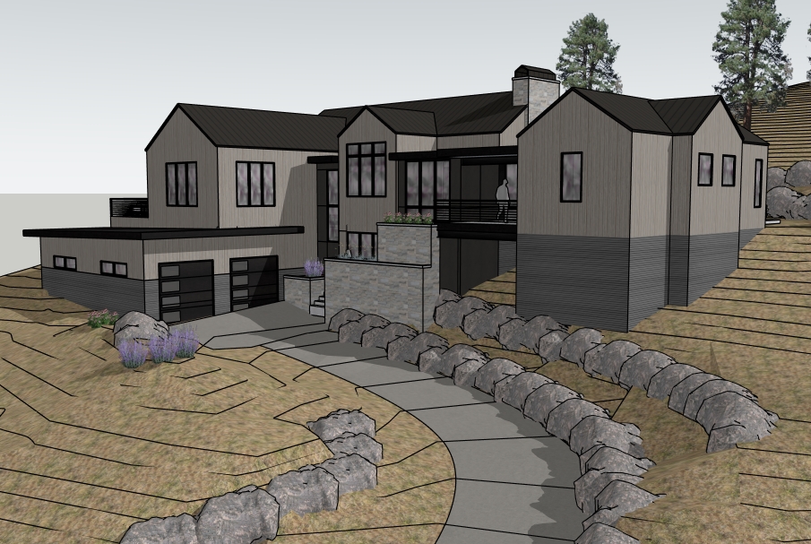 scandinavian modern home set into a hill side with a boulder retaining wall lined driveway to the garage exterior windows are light taupe vertical wood siding horizontal grey corrugated metal siding wainscot light grey stone veneer extra dark bronze metal roof black windows background is steep hillside with scattered pine trees