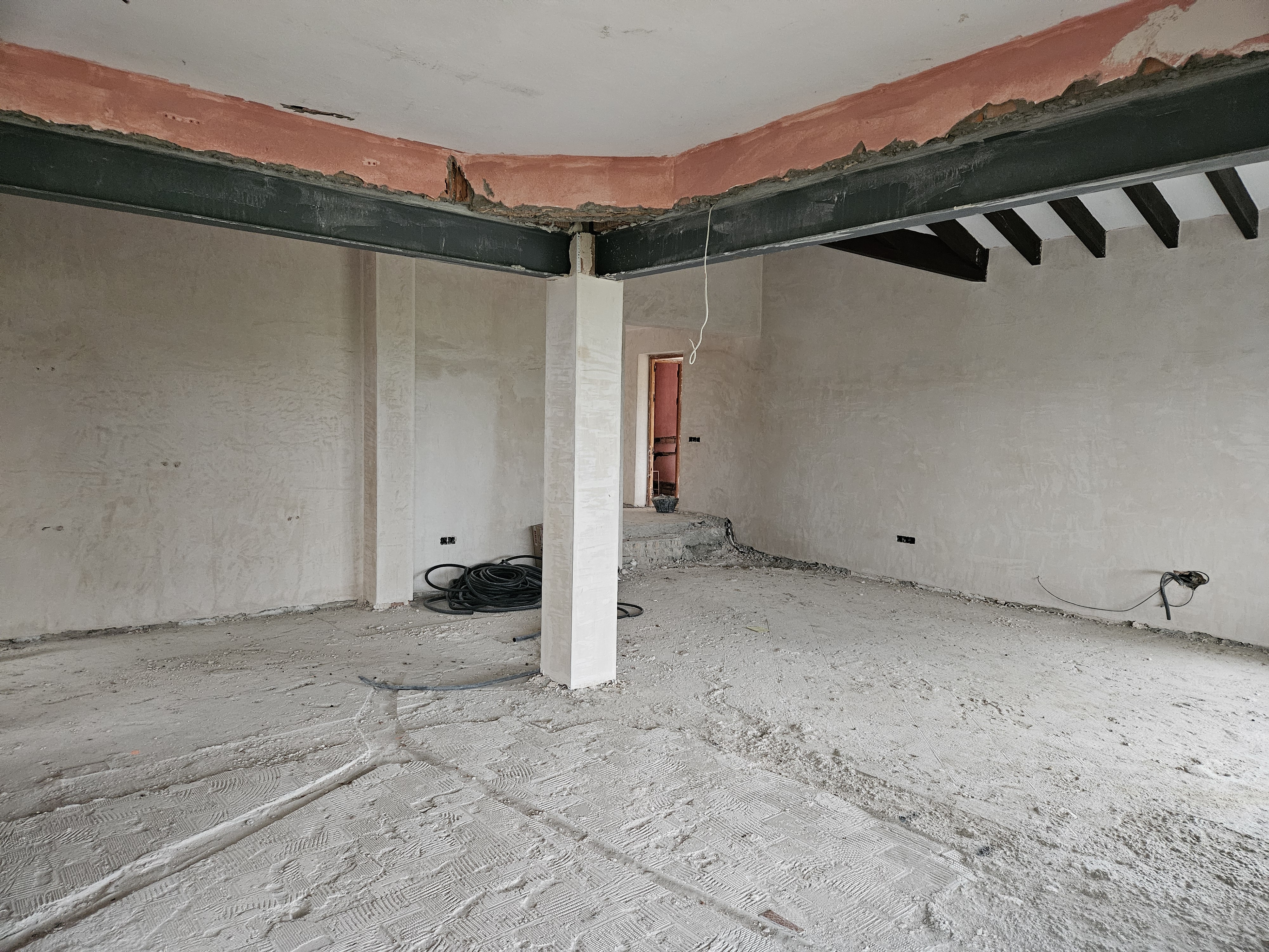internal dining room travertine stone floor roman apttern clad steel beams and perimter blukhead with higher internal ceiling four spot lights with decorative dinig table lamp traditional spanish dining room and lamp
