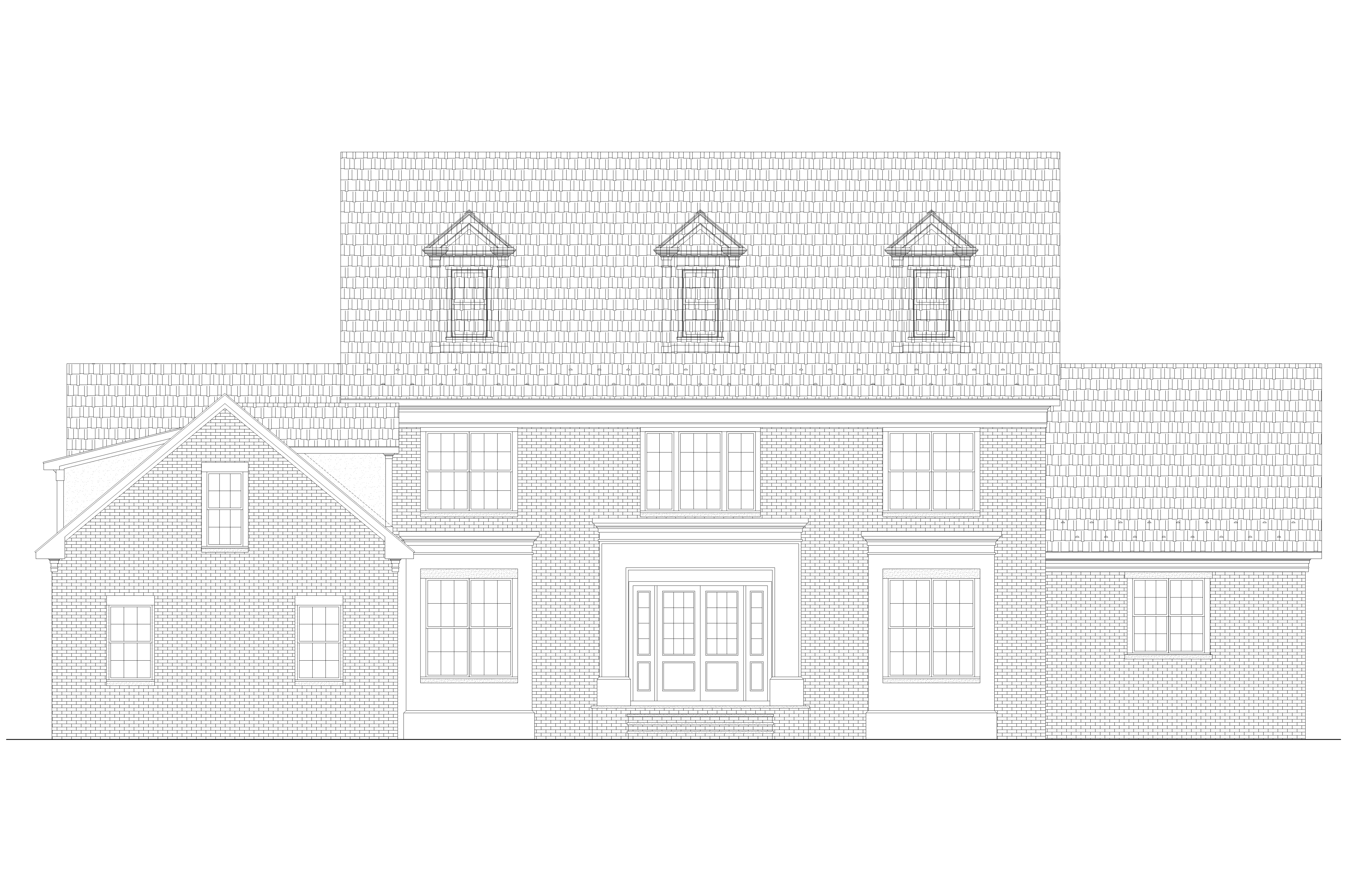 a modern colonial style with black shake roof shingles and cream colored brick white window frames wood front door and limestone surrounds for the front door and flanking windows