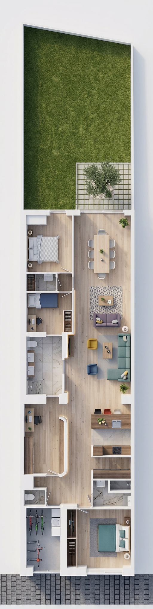 convert this floor plan into a realistic isometric 3d view of a full house show the space from an elevated angle with furniture walls and details visible analyze the provided floor plan generate the provided floorpan 2d residential floor plan into a high quality 3d isometric top down true 90 orthographic architectural photorealistic rendering floor plan of the entire plan keeping the exact same dimensions proportions walls doors windows and furniture placement as shown do not change layout scale or orientation style interior modern japanese japan with a soft neutral color palette of beige cream and light wood tones pavement sandstone tile 60x60cm light natura warm neutral tones beige off white soft grey minimalist furniture clean lines built in cabinetry stone or microcement surfaces matte black accents furnish the existing rooms in a modern aesthetic elegant interior light soft ambient interior lighting and soft natural daylight with subtle shadows architectural visualisation distortion no added or removed elements keep the tops of the walls cleanly cut and white to show the layout clearly windows behind are elevated 80cm of ground show dimensions on top in white use the same furniture as shows on the plan do not change the orientation of the floorplan