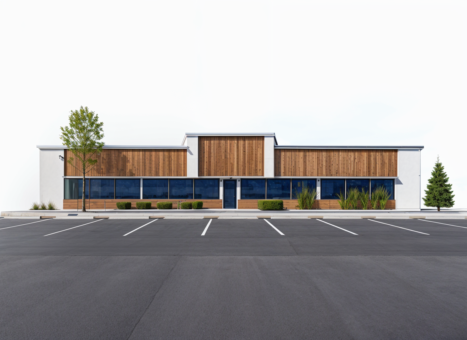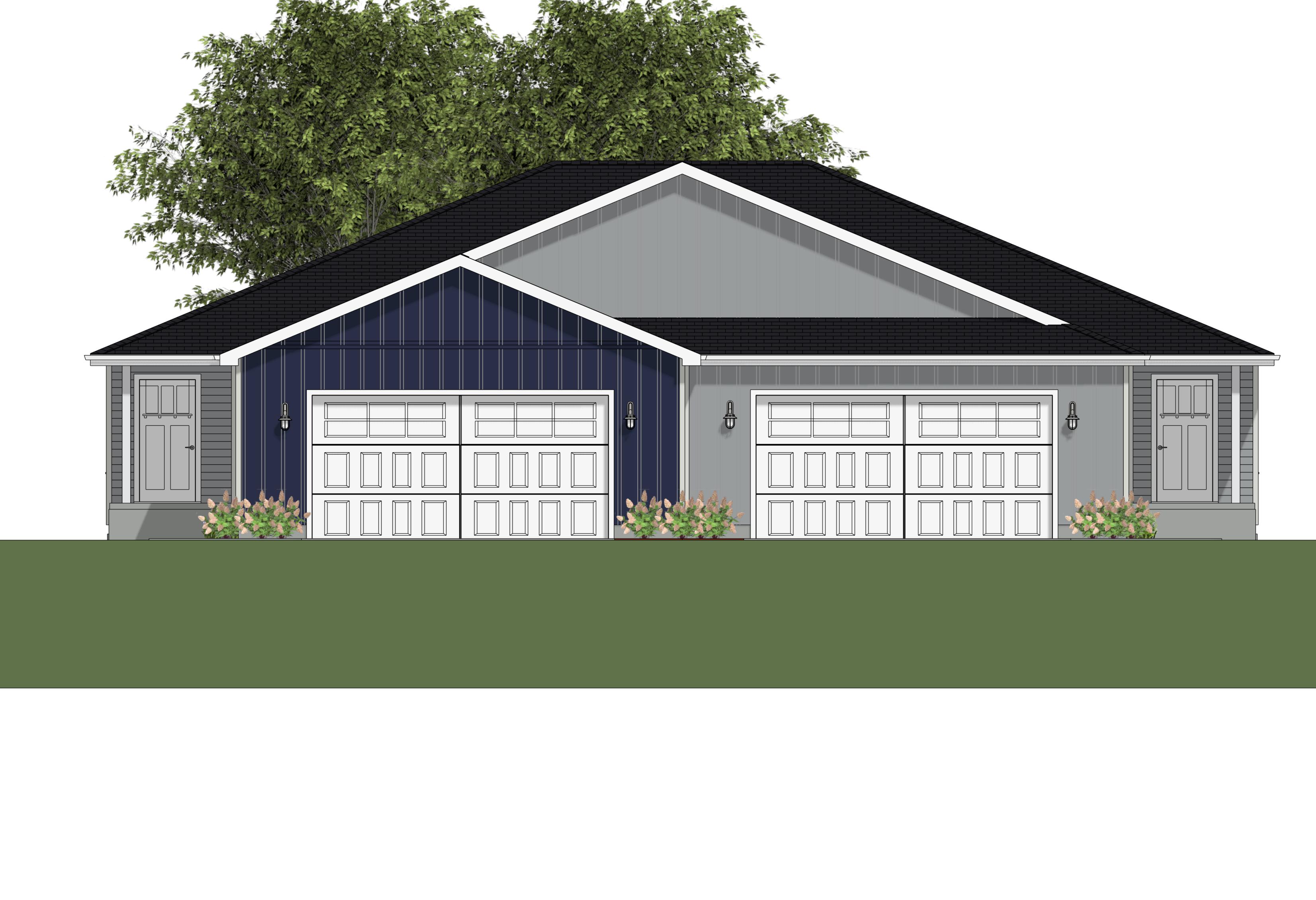 photo realistic maintaining dark blue siding at front facade light gray facade at right with white garage doors delicate floored path to front doors with concrete driveway lined with green lush grass afternoon sun with tree scape in background