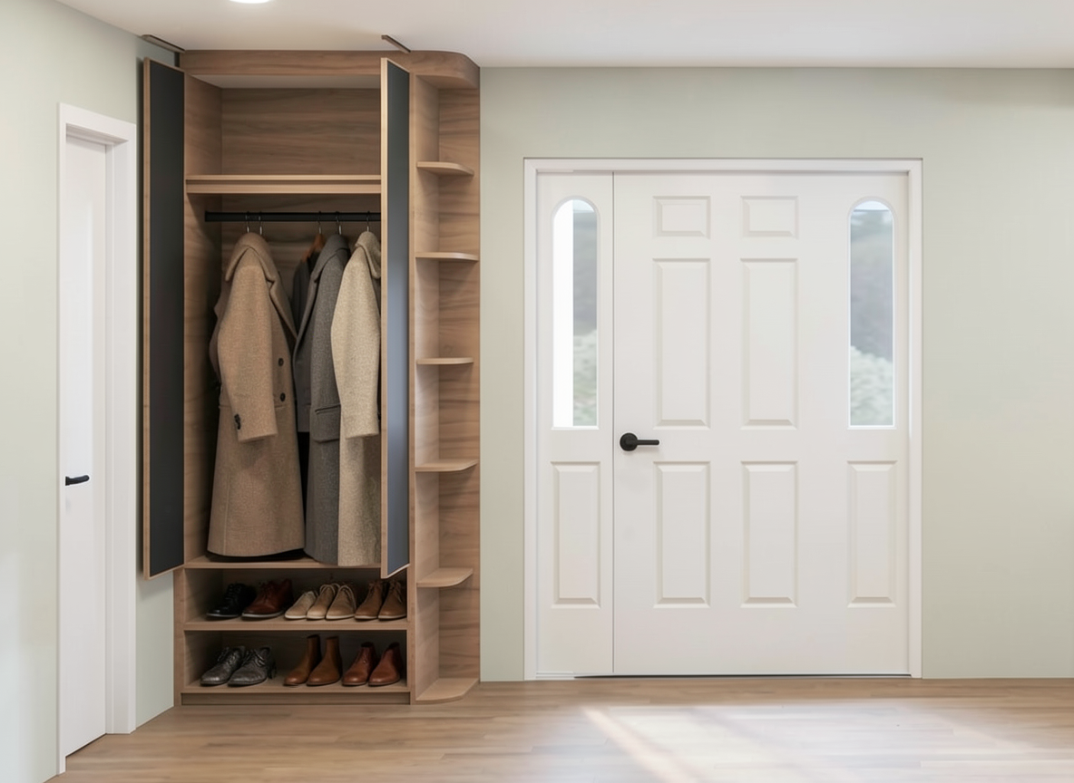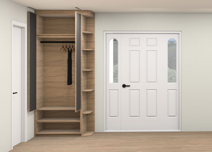 coats on the hangers shoes on the shelves below