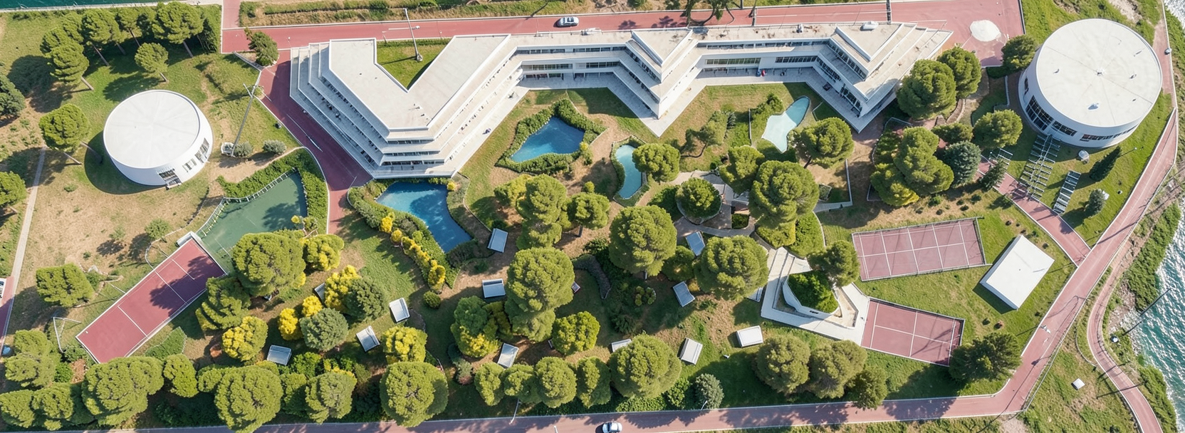 keep the shapes convert this image into an aerial view distinguish the yellow as vegetation mediterranean pines it is a space near the coast but the coast is not visible the red is the street change its color and make them asphalt keep the white roofs white and the maroon are tennis courts the white and round are facility buildings such as a shopping center the blue is water create a beach and pool environment always diffuse add vegetation on roofs and balconies