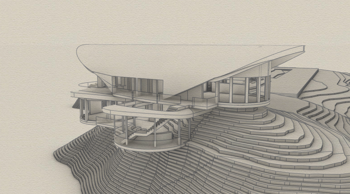 architectural watercolor rendering of a two story research facility perched dramatically on a steep natural mountainside replace blocky contour terrain with smooth realistic sloping rock and vegetation keep all building geometry exactly as modeled in the reference image at mnt data 5f423b97 5134 4fe8 86e3 d5c6bf756524 png feature a large curved black corrugated metal roof wrapping over the structure walls are matte gray metal panels include black steel framed windows throughout show an outdoor deck on the lower level with a curved black roof above it and a staircase passing through a precise void in that roof maintain the exact proportions as modeled background filled with distant layered mountains under cloudy bright blue skies add low lying fog near the bottom of the scene to emphasize high elevation render in a soft architectural watercolor style with visible pencil ink linework and gentle edge fading into paper texture maintaining high fidelity to the modeled geometry without altering form or scale