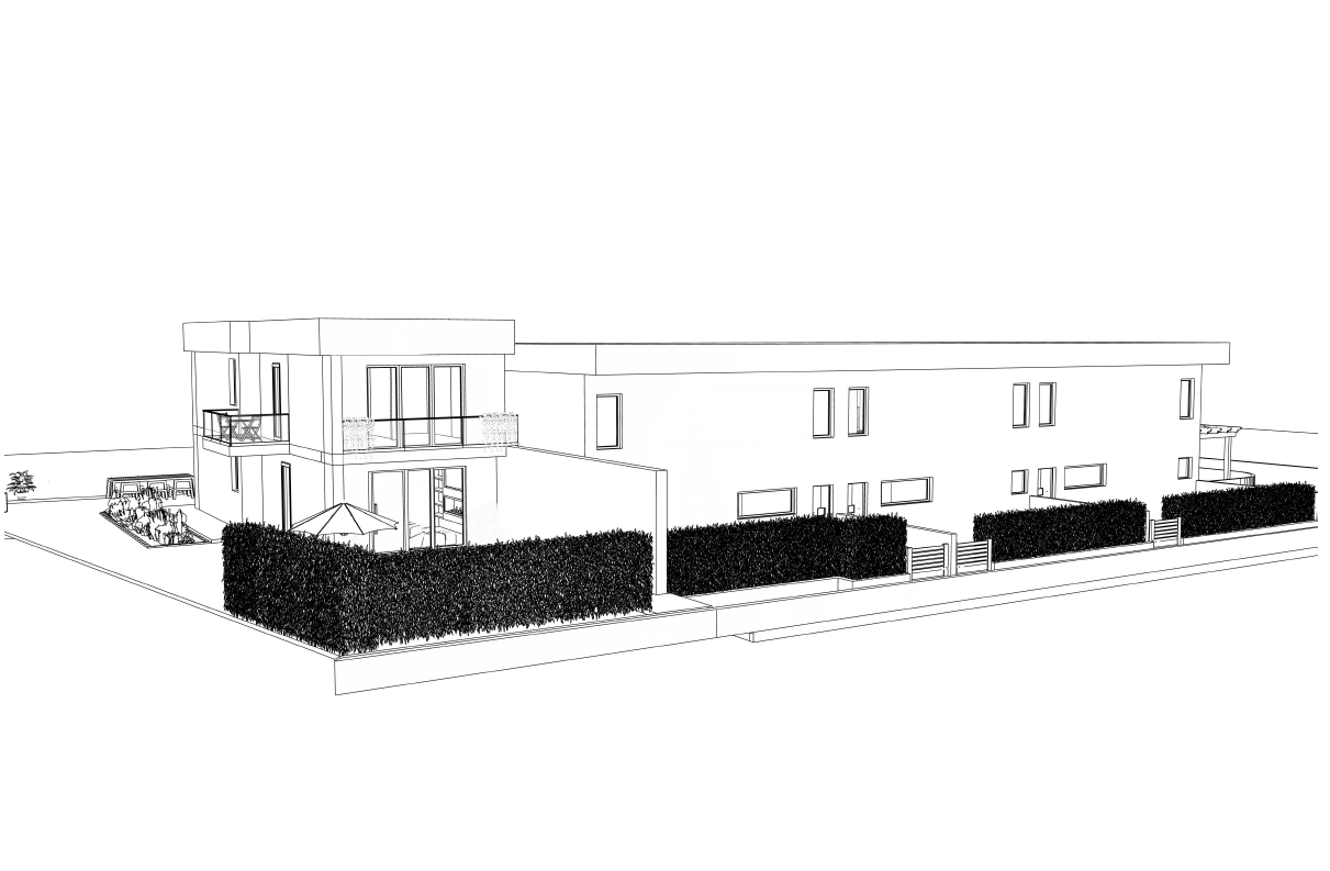 make a rendering of modern villas using modern elements white light neutral natural colors and materials in a green italian urban village ambient with green hills in the background and vegetation with people around