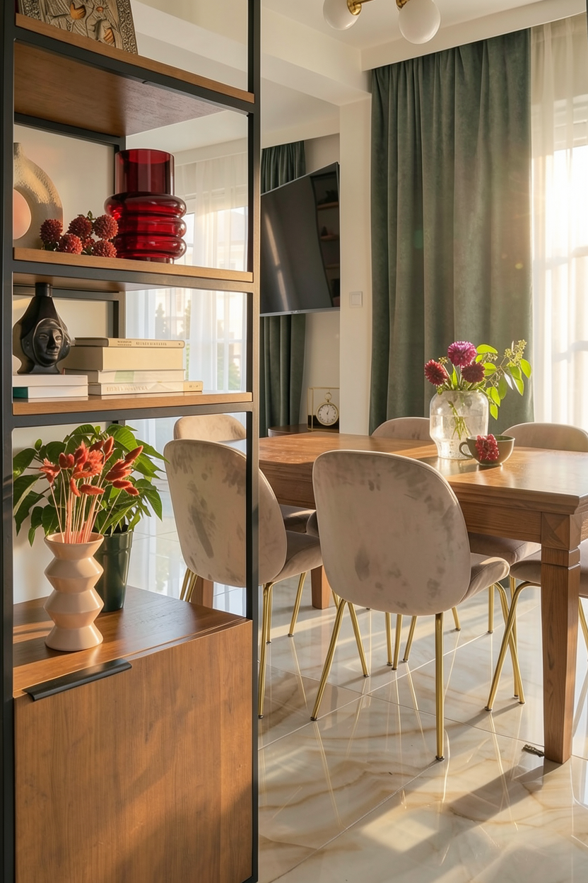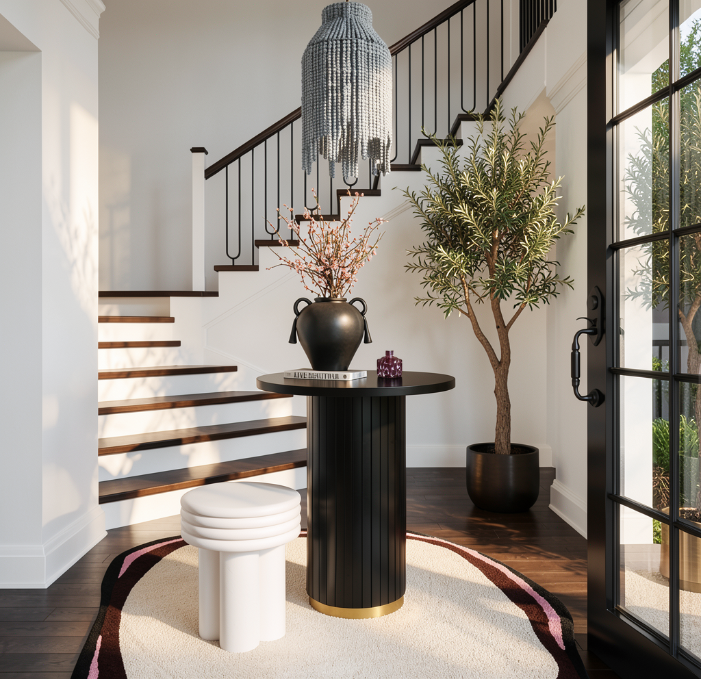 mark more modern organic with large black arch windows and banquet builting