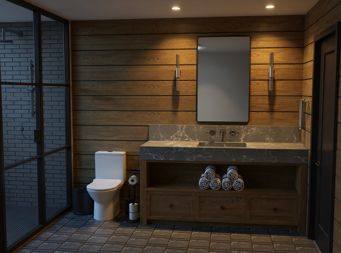 charcoal stone floor add ambient lighting add bright overhead lighting to add overall brightness to the space add daytime light add bright light in the shower white ceiling
