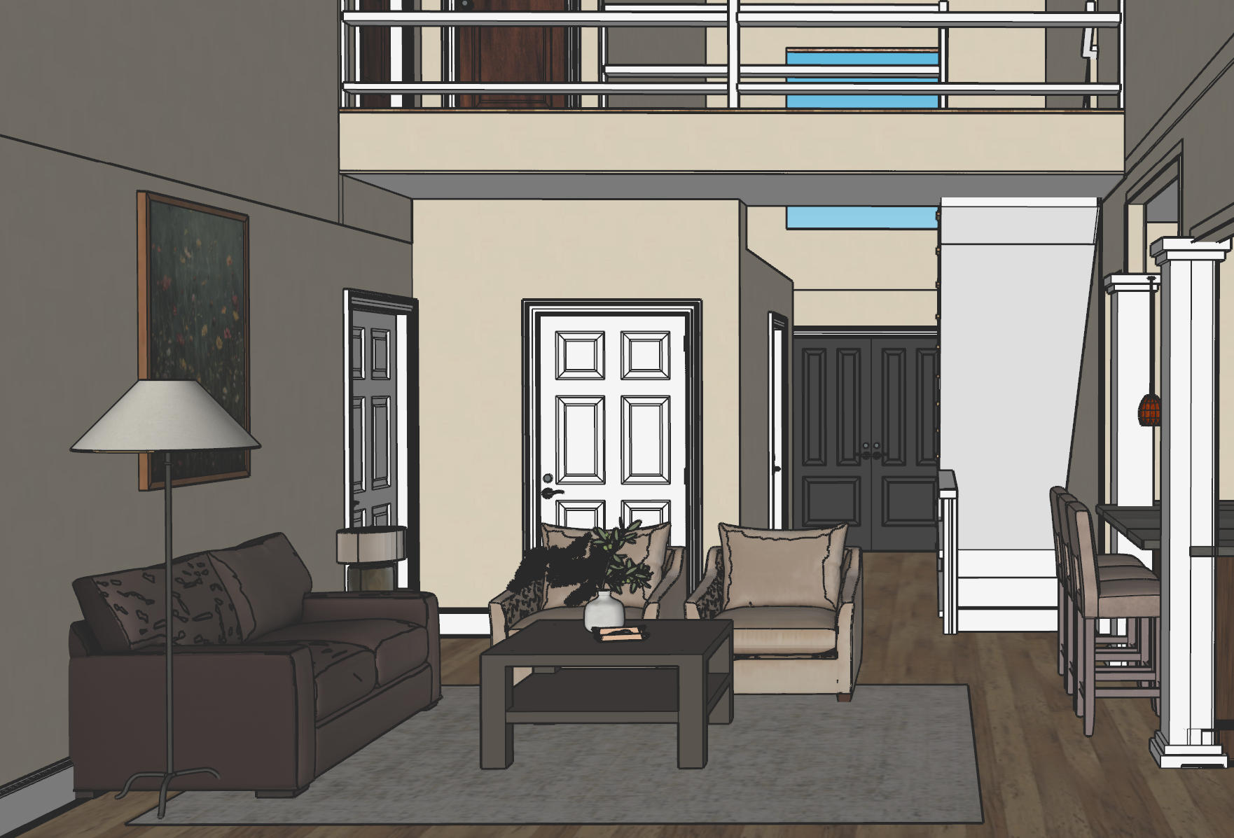 the doors and trim are white the floor is a natural oak hardwood the chairs are a camel velvet color the sofa is a brown pinecone color the railing is white the bar stools are black leather with wood legs the cabinets on the right are espresso the walls are a wheat beige color the rug is a beige and subtle gold and taupe distressed rug