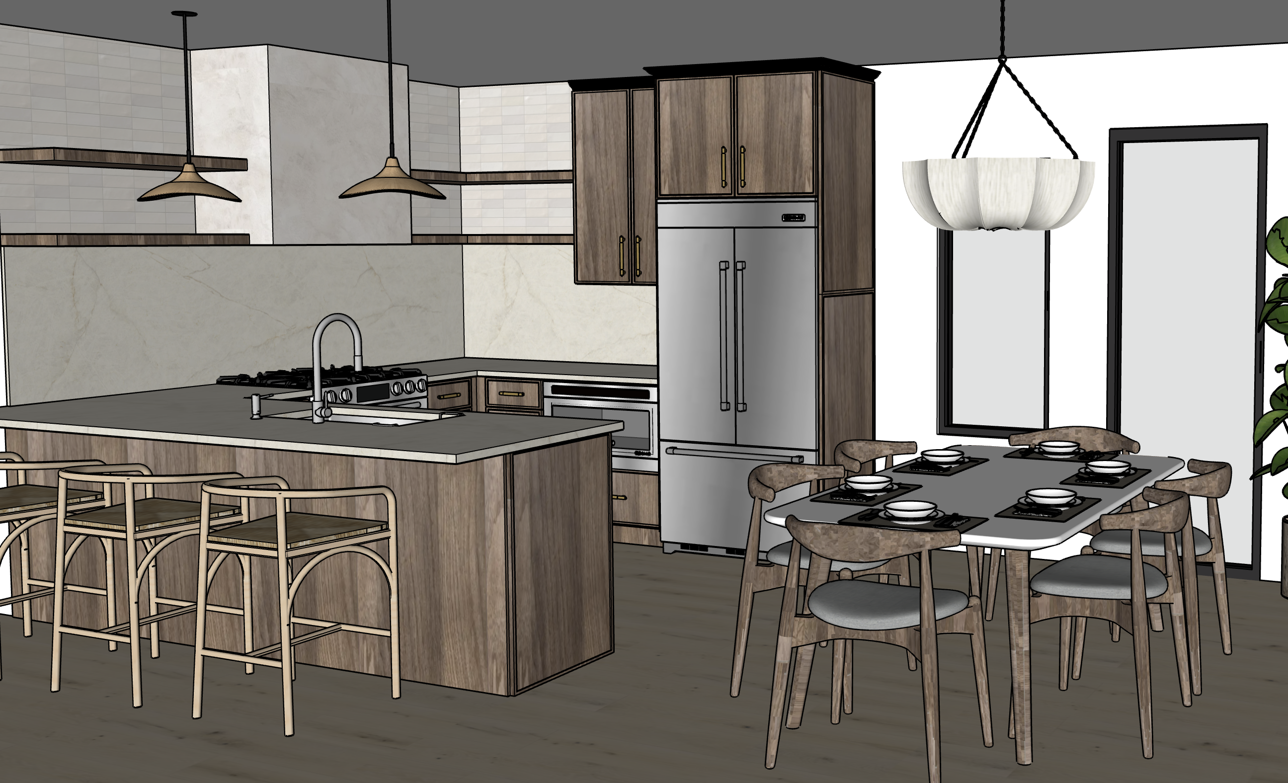the countertops and backsplash are a warm white stone with subtle brown veining called taj mahal the wood should be a slightly cool toned walnut the floors are a light white oak wide plank flooring make the faucet hardware a brushed champagne bronze color add soft sunlight coming in the windows and minimal styling to the open shelving the barstools at the pensinsula are a white oak frame with a woven light tan seat there is tile behind the open shelves in a slightly varied warm white horizontally stacked zellige the walnut cabinetry should be a slightly unsaturated walnut color tone it down a bit add some subtle blurred backyard scenery outside of the windows the pendents over the peninsula should be a natural fiber woven material in a light tan the pendant over the kitchen table should be a soft white linen like fabric the range hood is a warm white plaster or roman clay type finish