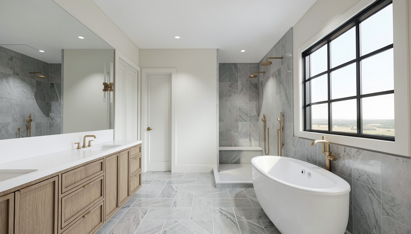 photorealistic enhancement of the provided architectural render preserve the exact architecture layout materials furniture placement and fixtures from the original image with no redesign or modifications the purpose is only to improve realism and lighting quality apply physically accurate global illumination and natural light behavior lighting should feel balanced and natural as in professional interior architectural photography soft indirect daylight fills the space with gentle light bounce from surrounding surfaces shadows are soft subtle and physically realistic with natural falloff all materials remain unchanged but respond to light more realistically stone surfaces with natural micro texture wood grain with depth matte plaster walls with soft diffusion and brushed metal fixtures with correct reflections no surfaces emit light unless they are actual light fixtures plumbing fixtures such as shower heads and faucets must remain non emissive and only reflect ambient light render as high end interior photography using a full frame camera with a 24 35mm architectural lens balanced exposure realistic dynamic range subtle depth of field and natural color grading the image should look like a professionally photographed luxury interior rather than a computer render do not change architecture do not change materials no redesign no new objects no additional lights no glowing fixtures no light from shower heads or faucets no dramatic shadows no surreal lighting no warped geometry no stylization the windows looking out to the exterior should be displaying mountains in the distance some trees and later in the afternoon the floor should be light medium oak wood planks like shown in original image the interior should be well lit there should be no stone in this image