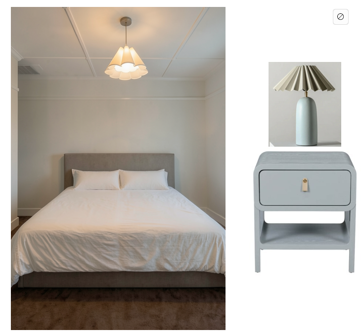 place only one bedside on the right side of the bed and one table lamp on the top of the bedside leave everything else as is fit the bedside next to the bedhead where it should be