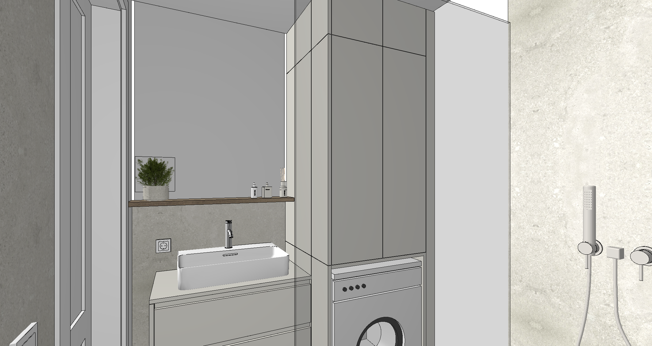 badezimmer ohne fenster warme lichtstimmung schrank in hellem beige seitliches led licht links und rechts bei spiegel armaturen bei dusche und waschbecken in edelstahl miele waschmaschine