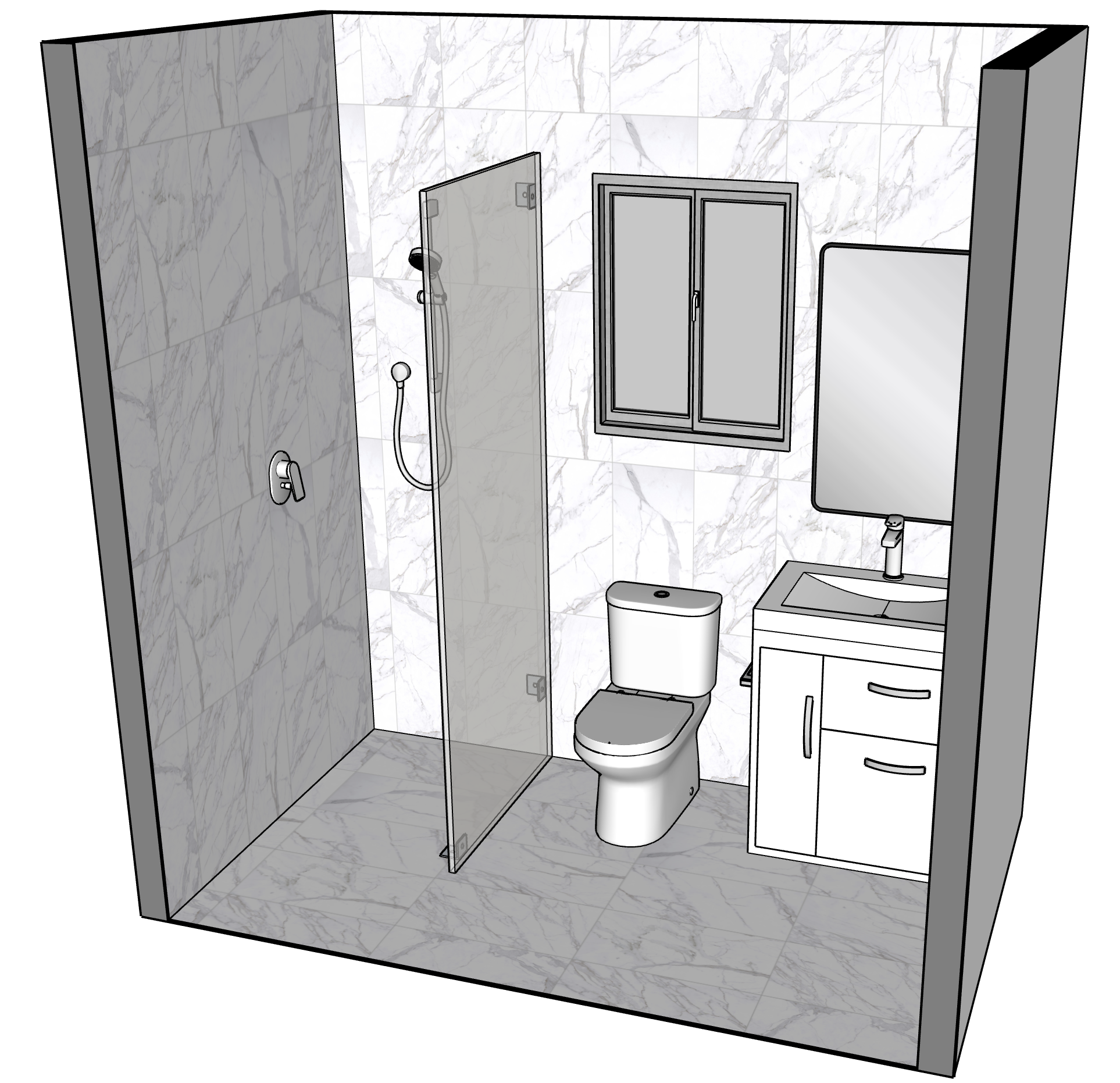 vanity is all white tiles are white marble fixtures are chrome