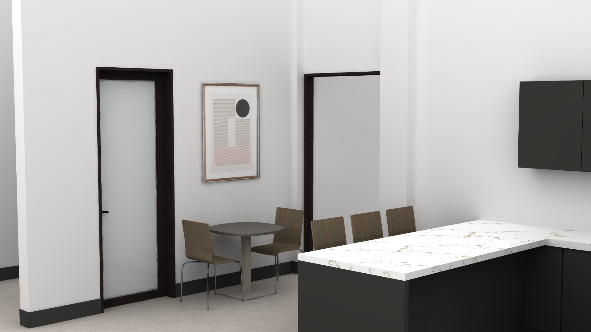 modern sophisticated break room inside a sleek medical office polished concrete floors keep wall art as is and kitchen as is make it feel welcoming and cozy there are no windows in the space