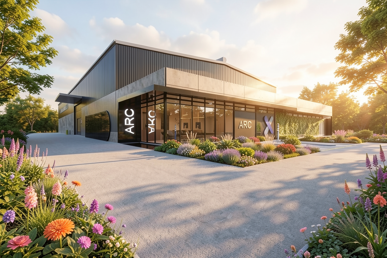 add few trees and vegetation to give it context add small but evenly spaced recessed circular on prortruding slabs 3 per slab add creamish interior warm lighting