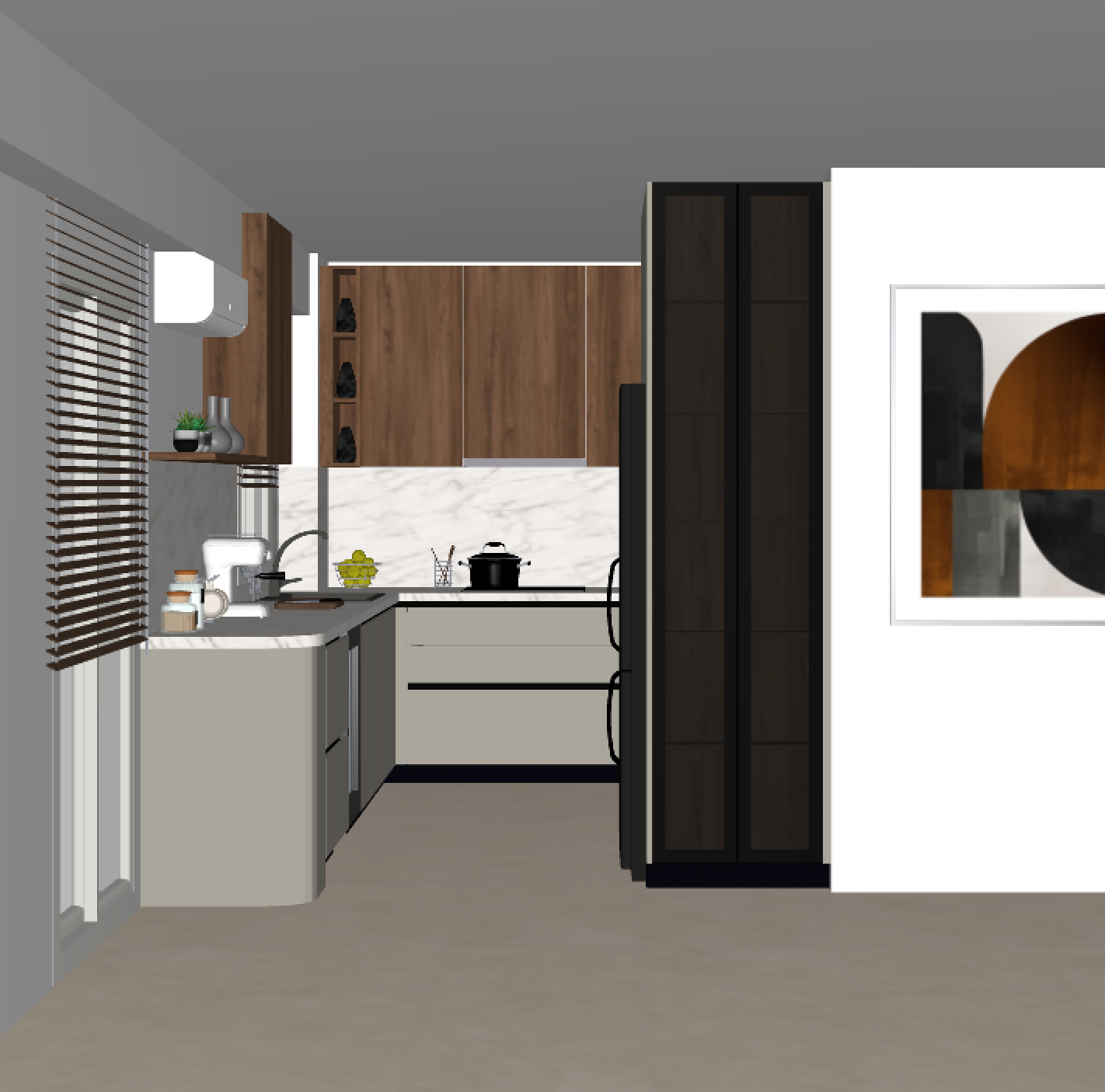 modern kitchen with a cozy inviting atmosphere cabinets are a warm wood brown adding a natural element the countertop and backsplash are a sleek glossy white marble with subtle gray veining for a luxurious touch the floor is a smooth light beige that complements the cabinets walls are a light gray providing a neutral backdrop appliances are a shiny modern black creating a striking contrast artwork on the wall features geometric shapes in shades of copper black and gray adding a contemporary flair the atmosphere is warm well lit with soft natural lighting streaming through the large window with wooden blinds