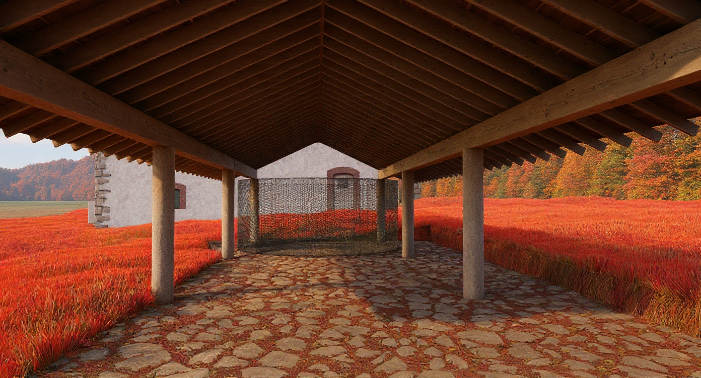 re render this image while strictly preserving the original camera angle perspective framing and composition do not shift viewpoint keep the same isometric underside view maintain the concrete and glass material palette retain the thin steel cable system evenly spaced but make them more subtle reading structurally but visually light keep the v frame geometry exactly as modeled sharp elegant minimal strengthen shadows toward the right side matching the long diagonal roof edge direction clarify edge definition and crispness the v supports should be visually dominant cables secondary avoid transforming this into a facade it must remain an underside structural view the overall feeling should be a refined architectural visualization of a light touch pavilion structurally expressive but airy