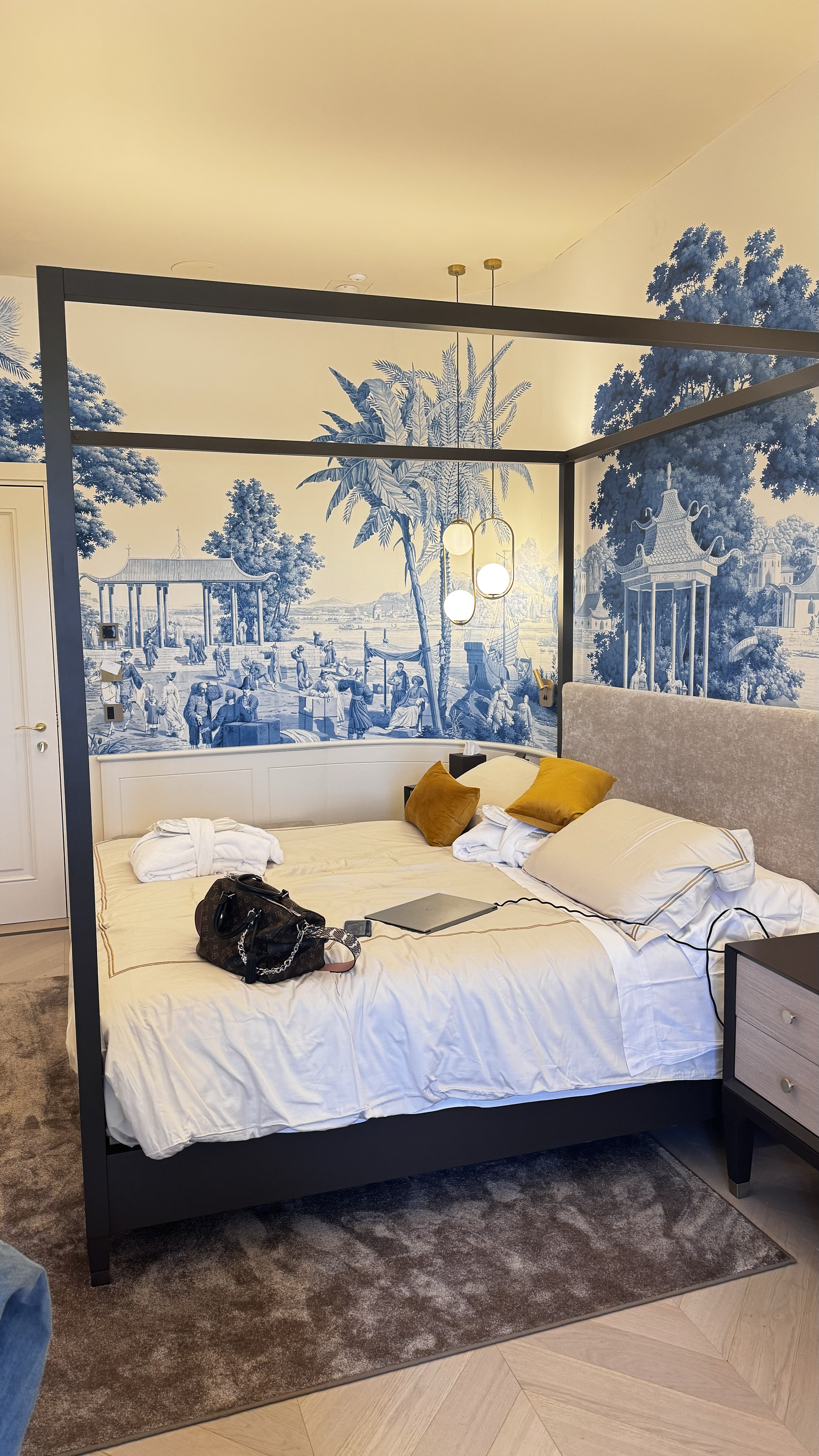 modernist interior shot leave everything exactly the same but remove objects from bed and make the bed perfectly made like in a luxury hotel architecture