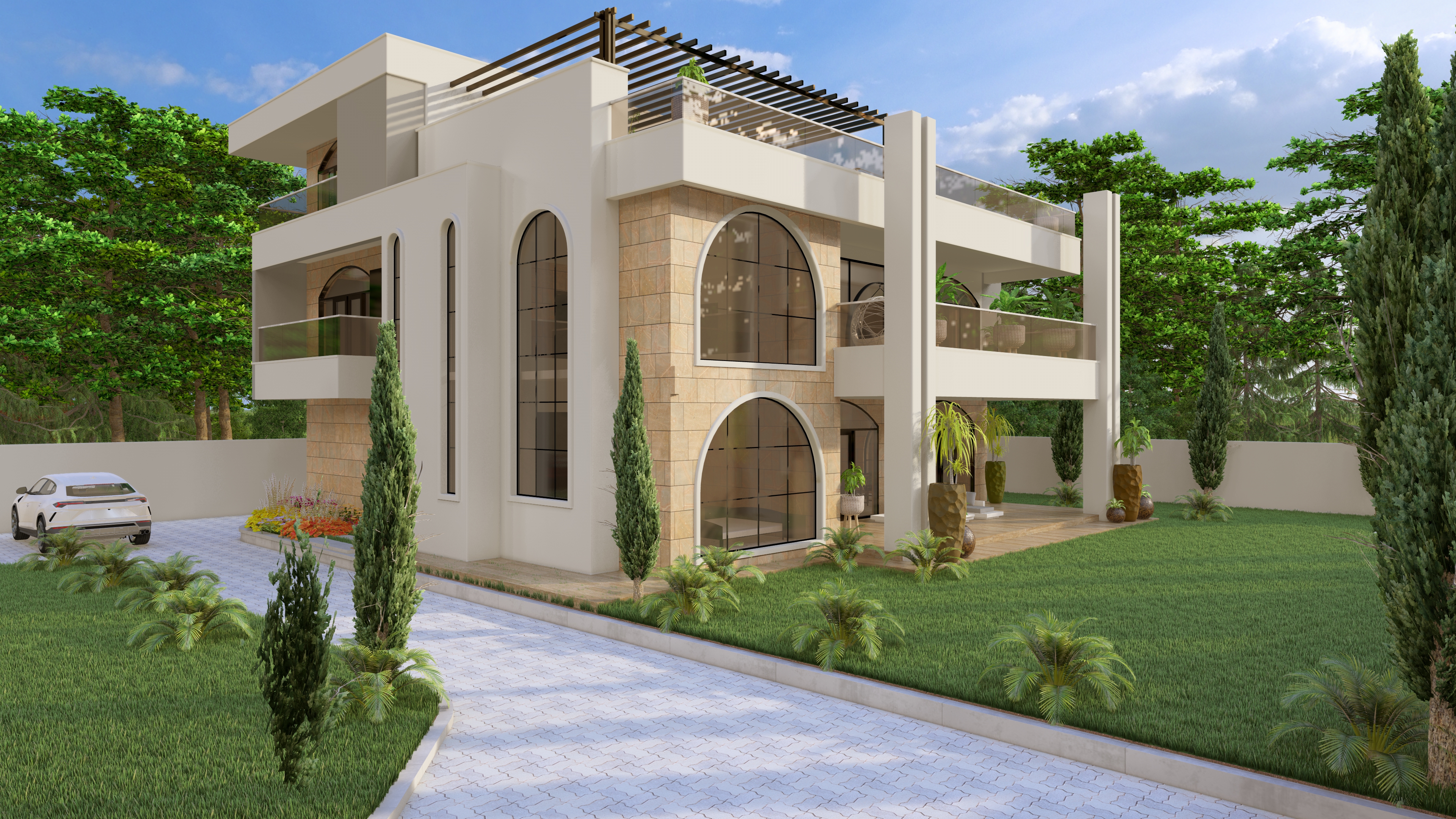 this is a modern mansion with white finished plaster surfaces gray paint on finished plaster and stone finished surfaces keep all materials as they are enhance texture add indoor warm lighting brighten the scene with daylight the windows and doors should have curved tops as they are no adjustments on shapes of any elements add indoor warm lighting yellow ish downlights for cantilevered slabs and wall lights strategically