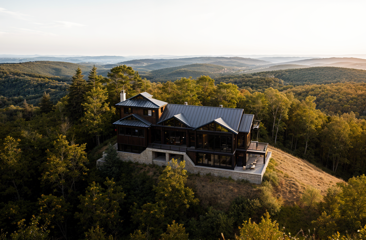 barndominium exterior shot house on a big mountain in mont tremblant sunny morning close to noon terrain goes up to main level on the right side black metal roof black windows and dark wooden finishes architecture
