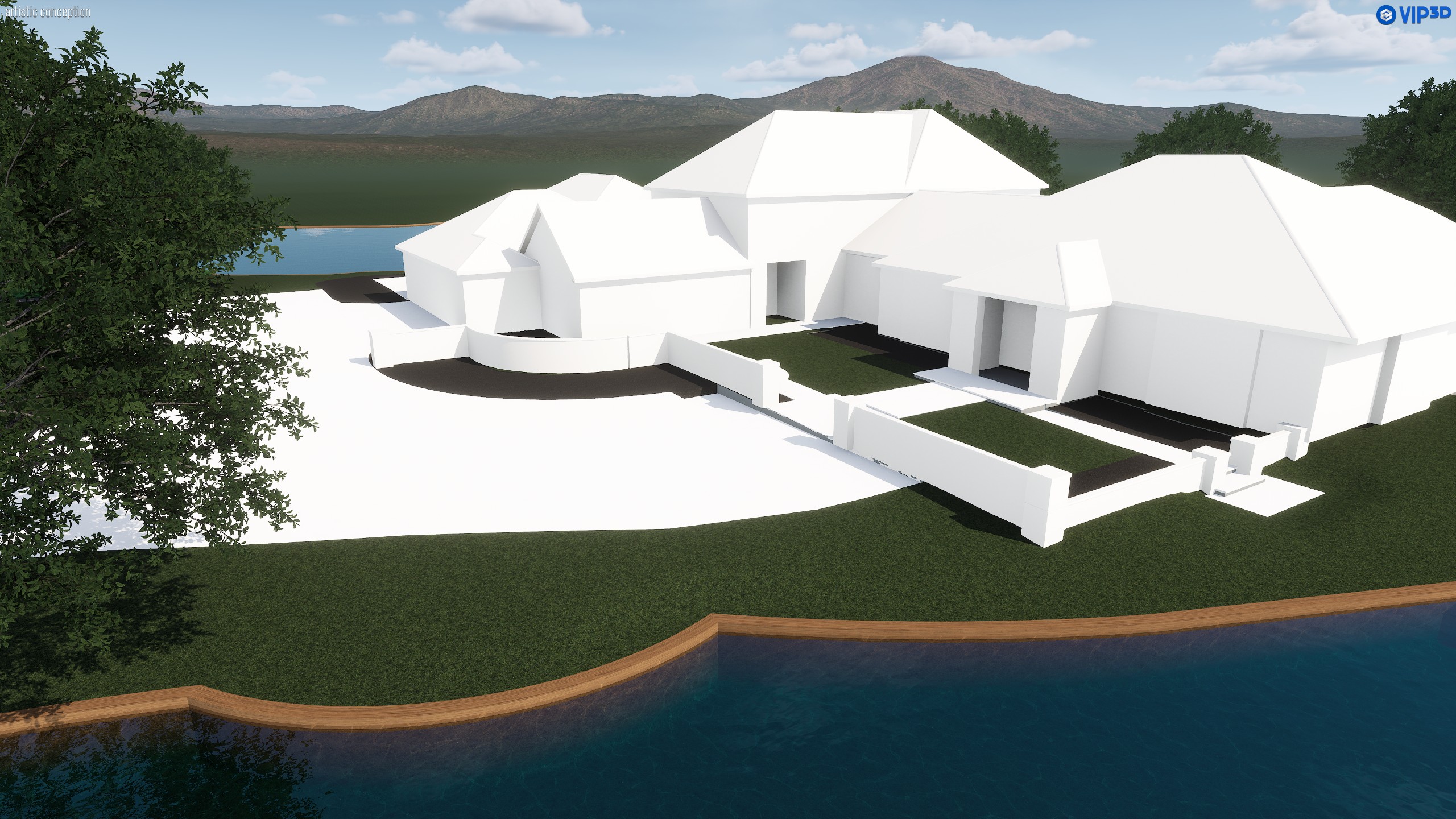 traditional louisiana landscaping with lake and oak trees behind house