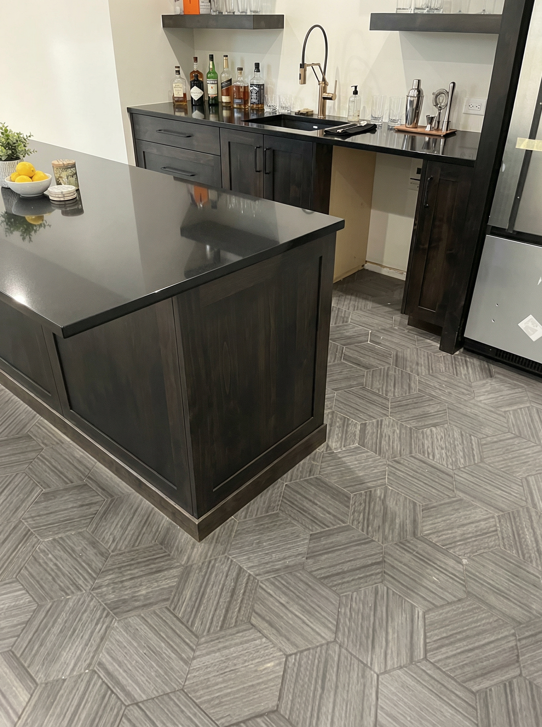 add quartzite counters grey beige color 3x6 wall tile backsplash add two pendants over the large peninsula add three sconces over the main window