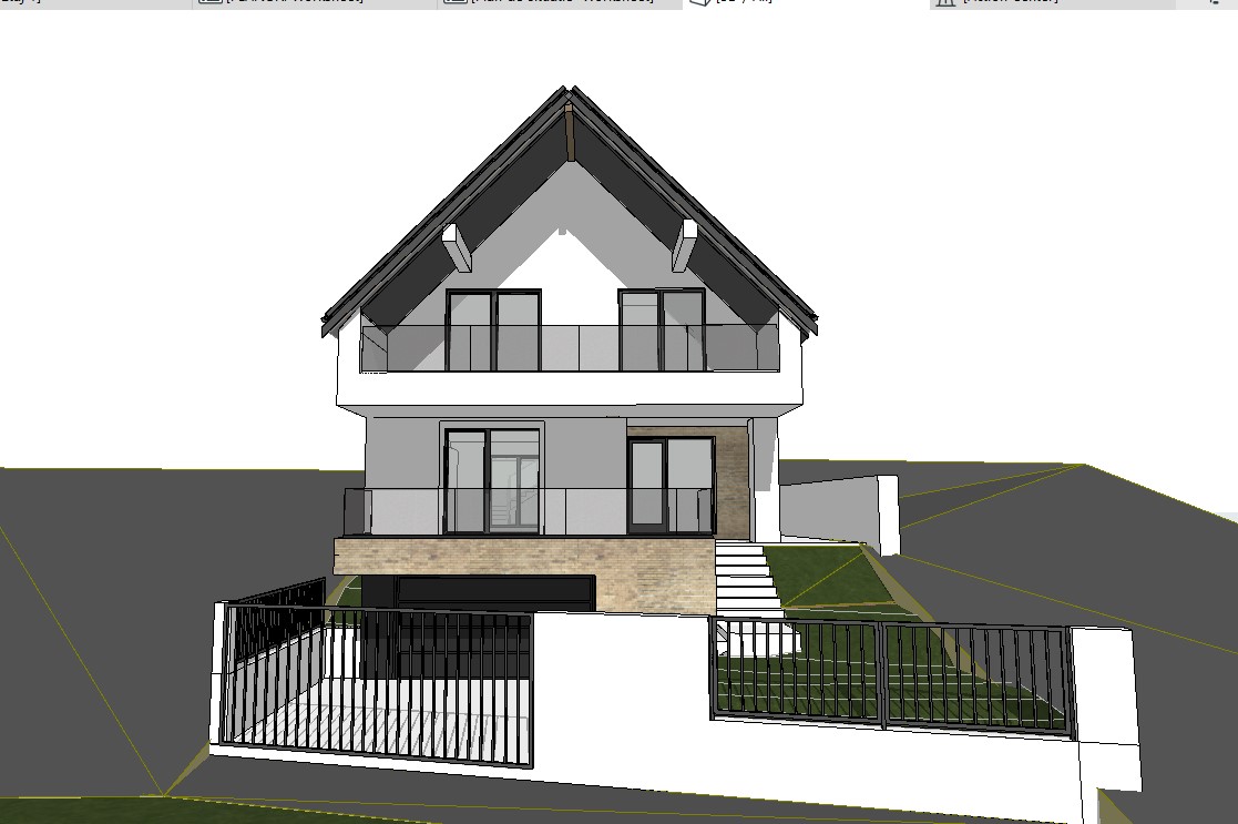 modernist exterior shot a beautifully rendered modern minimalist house set amidst a serene natural environment the house features angular wooden structures with a dark gray and black exterior large glass windows reflect the subtle hues of the surrounding landscape the wooden siding has warm earthy tones like soft browns and is combined with sleek contemporary black trimming the atmosphere is tranquil and the lighting is soft mimicking a gentle morning or late afternoon light the ground is adorned with patches of green moss and vivid yellow wildflowers adding a burst of color and life the surrounding trees are leafless drawn with delicate thin black lines indicating the late autumn season shadows of the trees create an intricate pattern on the house and the ground in varying shades of gray and brown the entire setting feels both modern and natural embracing simplicity and elegance architecture white facade keep windows from concept the background is forest please preserve the architecture and proportions of the building