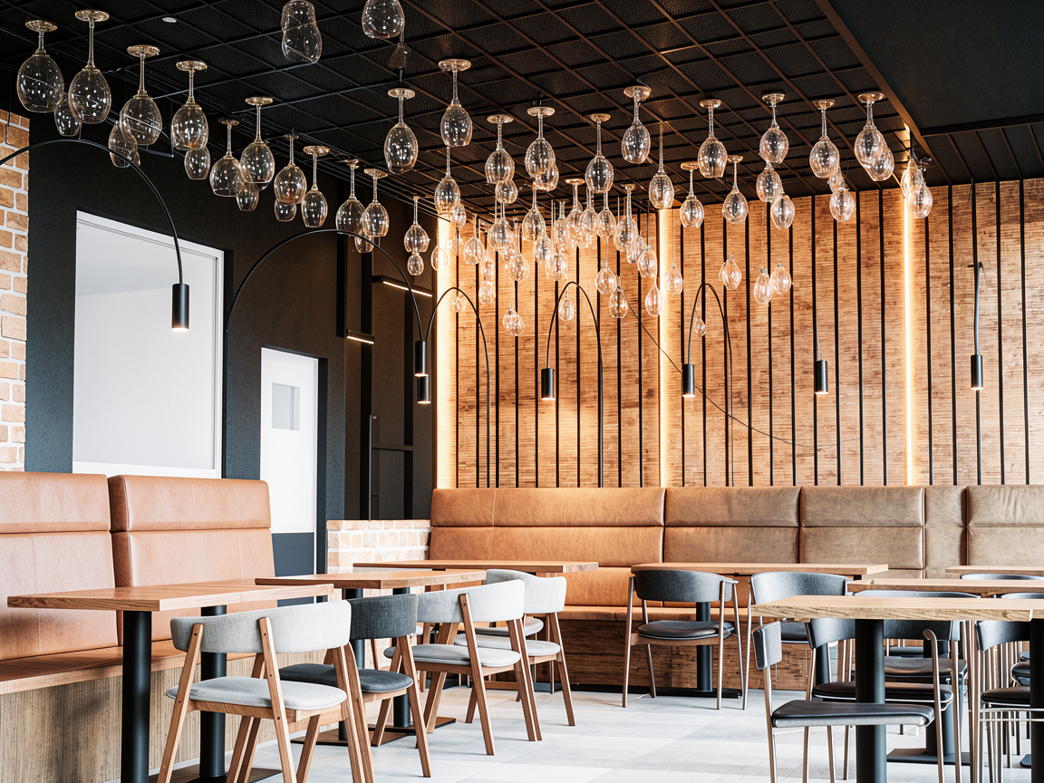 refine the current image while keeping everything exactly the same do not change composition ceiling design wine glass installation lighting mood or materials critical instruction remove only the string lights located on the back wall delete all fairy lights that are hanging or draped across the walnut wood slat wall the wall must remain clean showing only the vertical integrated led light strips between the walnut slats protection rule very important do not remove or modify any string lights in the ceiling installation the micro led string lights integrated into the black ceiling grid between the hanging wine glasses must remain exactly as they are these ceiling lights are required and must stay fully visible clarification there are two different types of lights 1 wall string lights must be removed 2 ceiling string lights between wine glasses must remain unchanged only remove type 1 keep type 2 completely intact do not change anything else in the image the final result should look identical to the current image but without any string lights on the wall