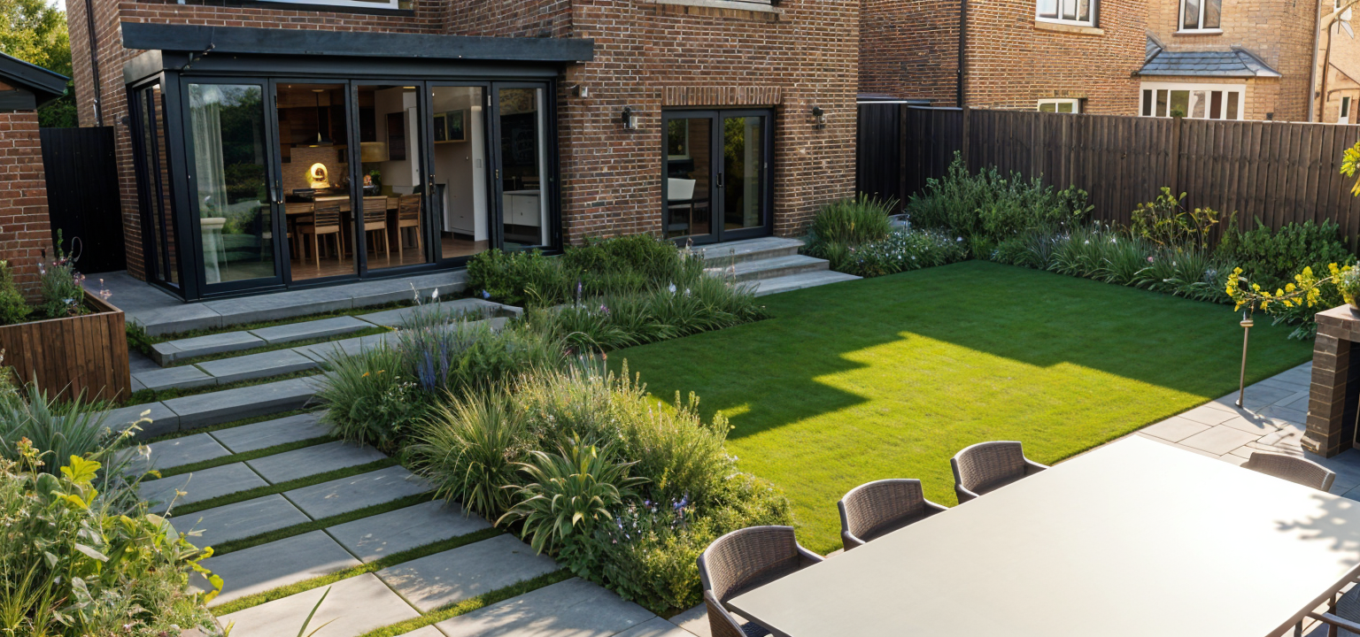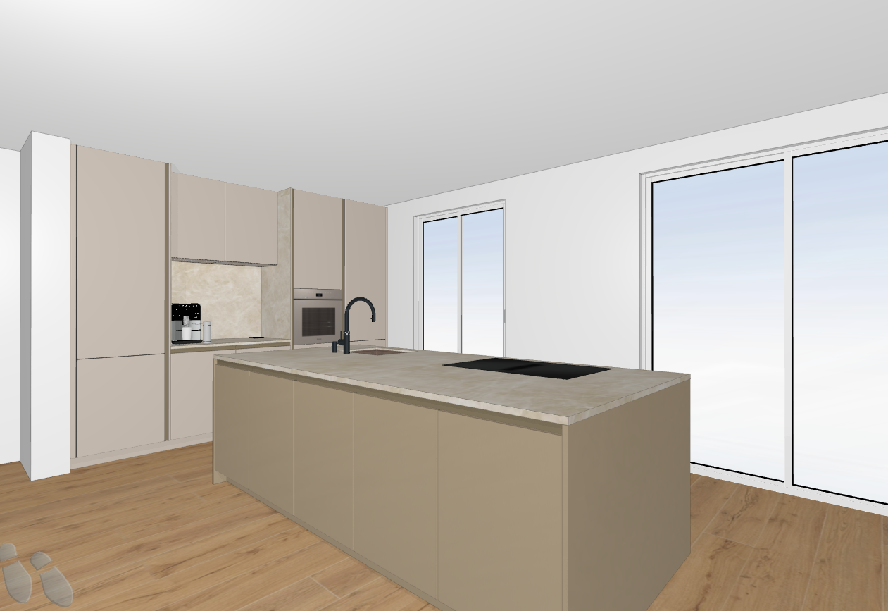 das ist eine k che die farbe von hoshschrankzeile in beige und insel in metallic laminat bronce wasserarmatur in gunmetal gardine vor dem fenster das sonnenlicht kommt auf dem boden griffleisten in bronce nische mir indirekte beleuchtung