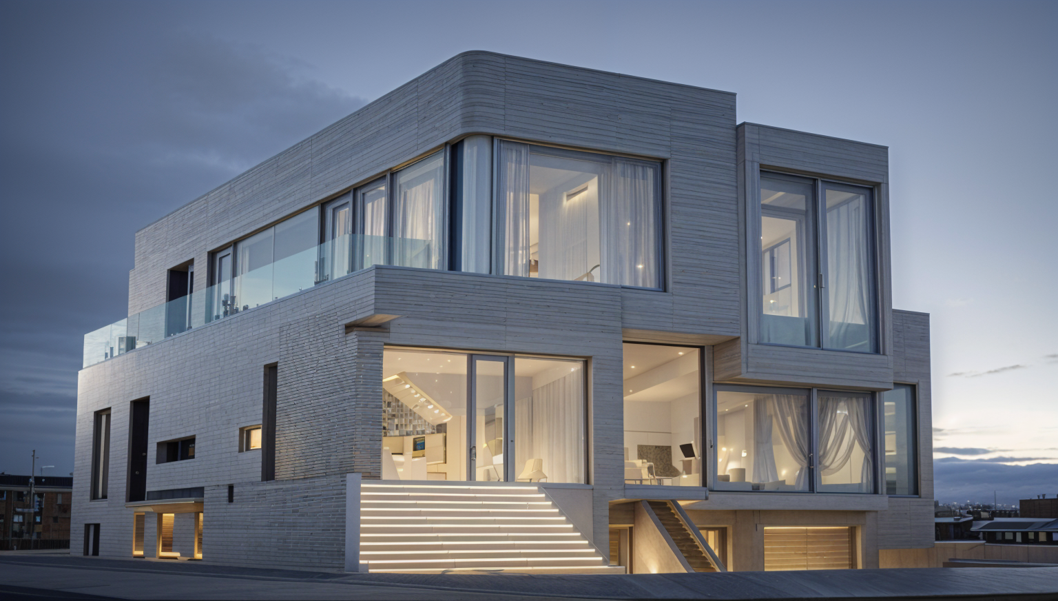 create a realistic night scene of this modern tropical house keep the same camera angle and composition the scene should be warmly lit with ambient glow from the interior spaces visible through the windows add soft yellow lighting from wall sconces and under the eaves the carport should have subtle downlights illuminating the parked cars add realistic shadows reflections on the car surfaces and a slightly wet pavement for extra realism the surrounding trees and landscaping should be softly illuminated by low garden lights the sky should appear dark blue with faint stars evoking a calm cozy evening atmosphere