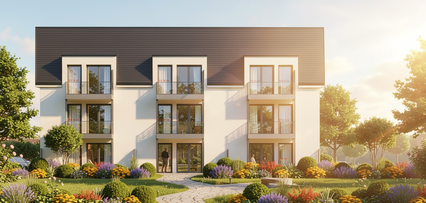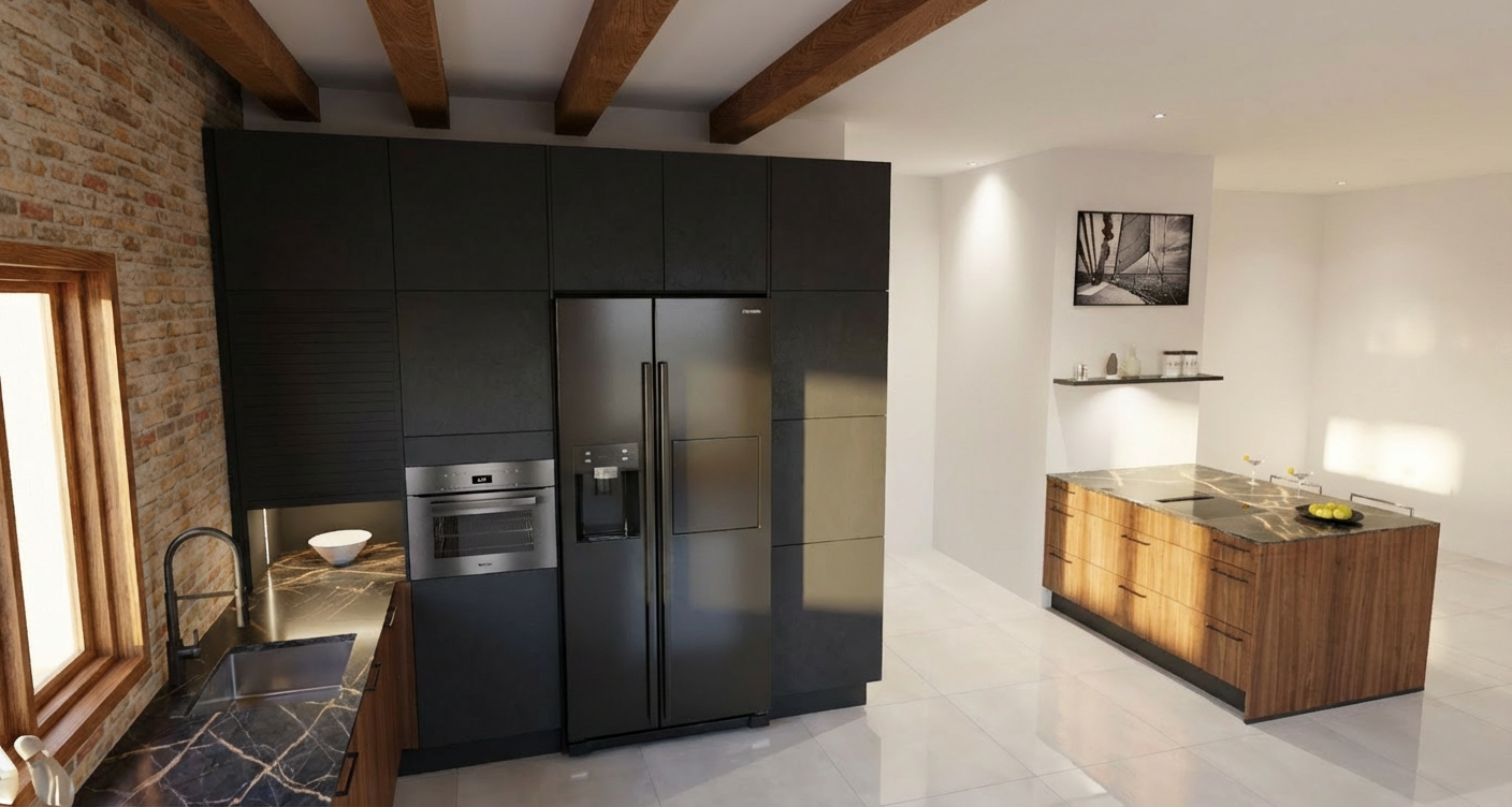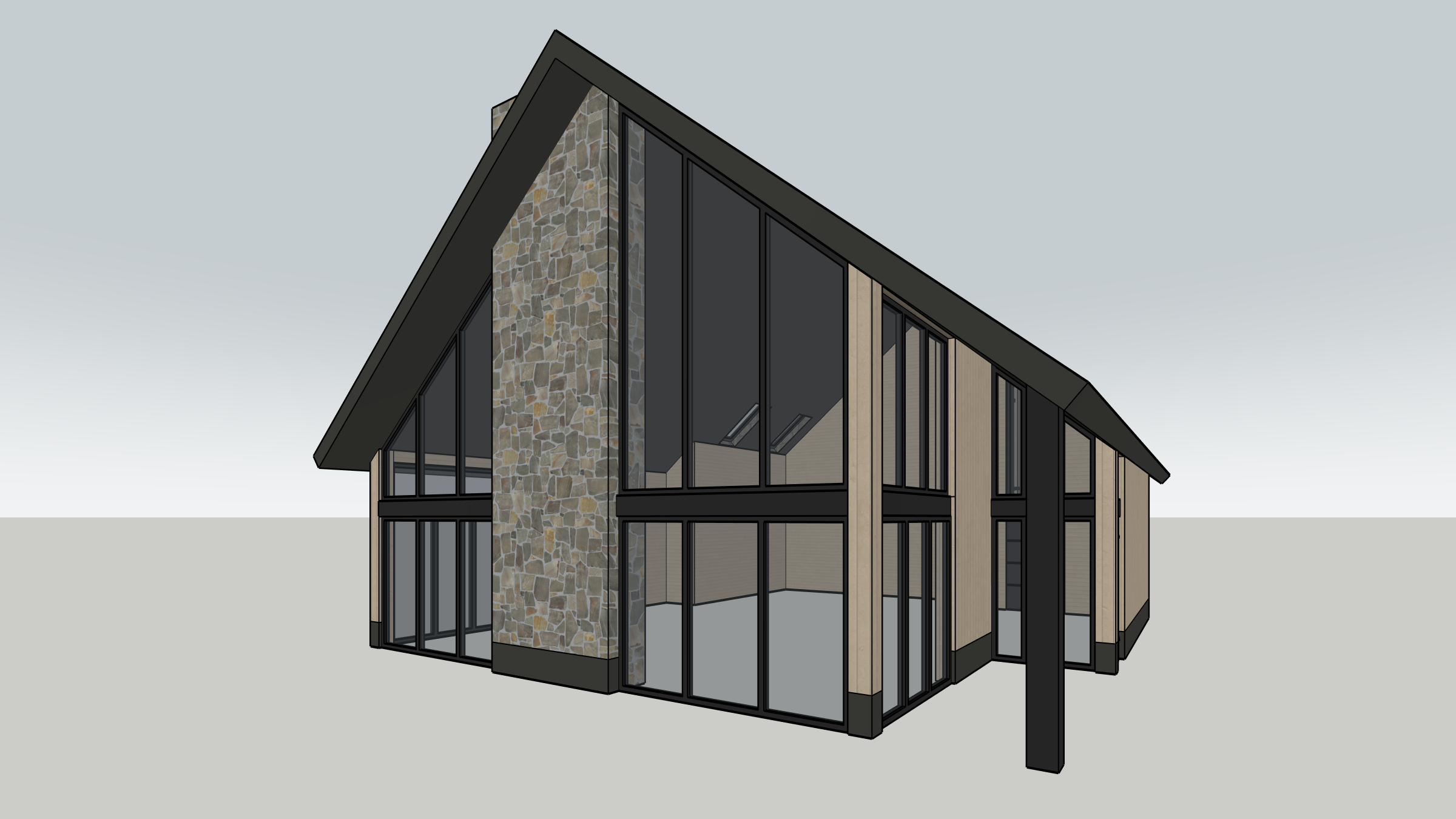 photorealistic architectural exterior visualization from an elevated east rear perspective precisely maintaining the camera angle geometry and proportions of image 15 png showing the main high gabled glazed facade and central bisecting dry stack flagstone chimney of the modern dutch barnhouse schuurwoning complex this massive central dry stack flagstone masonry chimney with rugged slate grey texture precisely bisects the glazed two story gable facade all large glass panels across all facades are made of heavily warm smoke tinted glass warm smoked glass with a high degree of tint that obscures visibility into the interior spaces providing complete privacy yet allows the intricate precise 30mm matte black mullion roeden grid to be clearly defined and visible from the exterior against the dark private interior void the grid structure is sharp and defined while the interior is a deep warm dark tinted volume the attached side gabled window in the vertical weathered cedar wood siding volume is a cleaner large pane design distinctly without the heavy 30mm mullion grid and is also made of the same heavily warm smoked glass appearing as a smooth private dark plane a continuous 50cm tall concrete plinth smetrand cast in a dark warm grey tone donker warm grijze tint with a subtle formwork texture runs below all visible ground floor walls the gem leerd multi toned natural slate roof on the attached wooden volume is retained featuring two large flush integrated velux pk12 94x180cm black frames roof windows starting at approximately 1 5 meters high inclusive of the 50cm concrete plinth and wall section below the foreground estate grounds based on image 14 png layout features minimalist empty clean stone paver terraces extending around the flagstone concrete plinth and glazed base with natural wild grasses and ferns growing near them in the far background beyond the dense bomenrij of mature native oaks a rustic dirt karrespoor track is visible leading to an open perspective over brabant meadows and fields late afternoon golden hour lighting highlights the deep rugged textures of the flagstone chimney the detailed slate roof tiles the weathered wood grain and the defined mullion grid against the private warm smoked glass hyper detailed pbr textures 8k resolution cinematic lighting architectural photography quality no text from the plan is rendered
