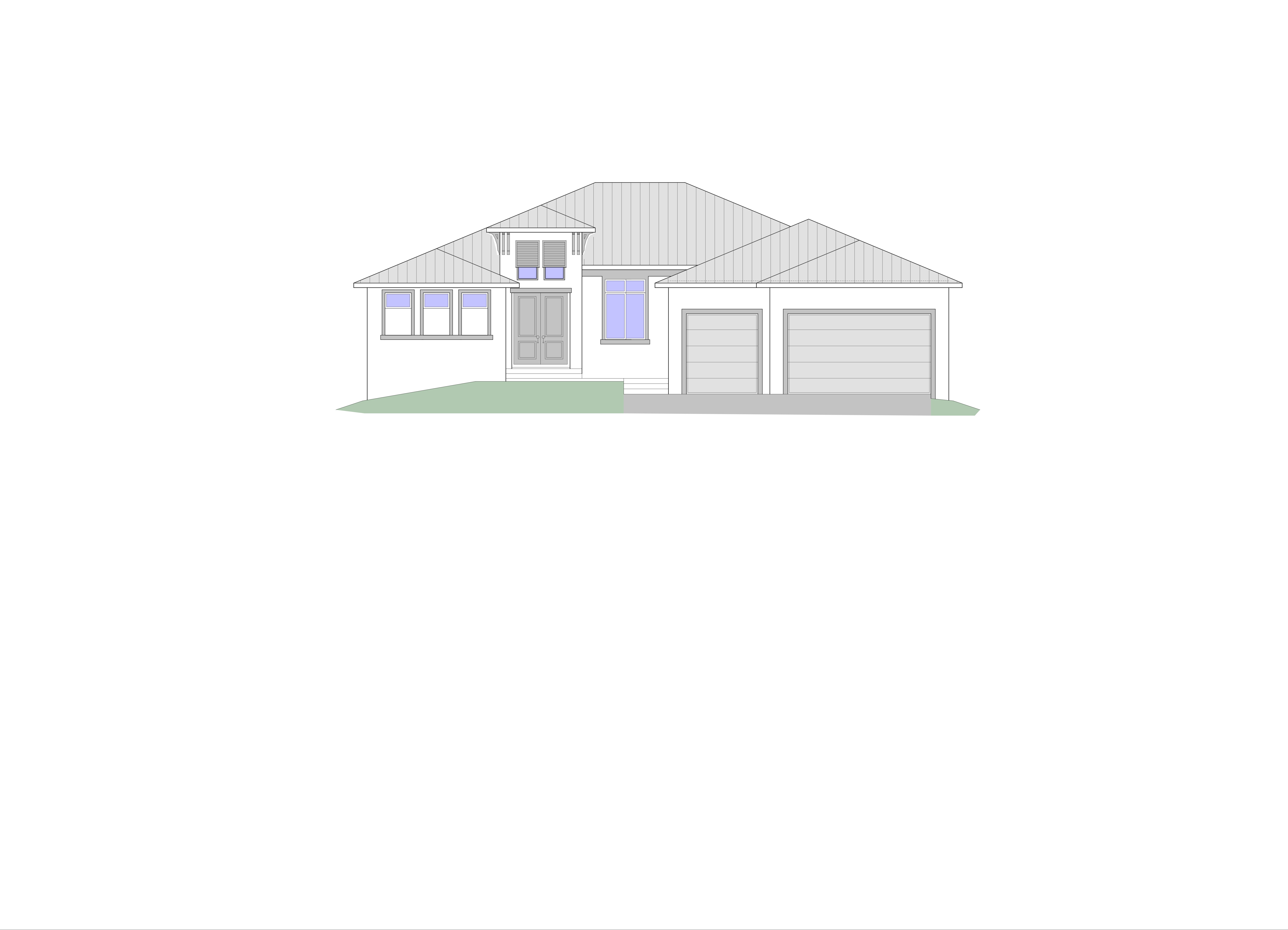 show a light grey standing seam metal roof dark grey corbels dark grey banding around windows and garage doors the short windows on the left side of home shown in blue have smooth finish white stucco between the bottom of the windows and the 4 banding shown below there are 2 dark grey bahama shutters above the entry windows the entry doors are 2 panels each and painted dark grey the garage doors are light grey the base house is smooth finish stucco painted white dark grey dappled paver sidewalk with 4 steps terraced from entry doors sweeping wide to the garage tropical landscape with blue sky and fair weather clouds