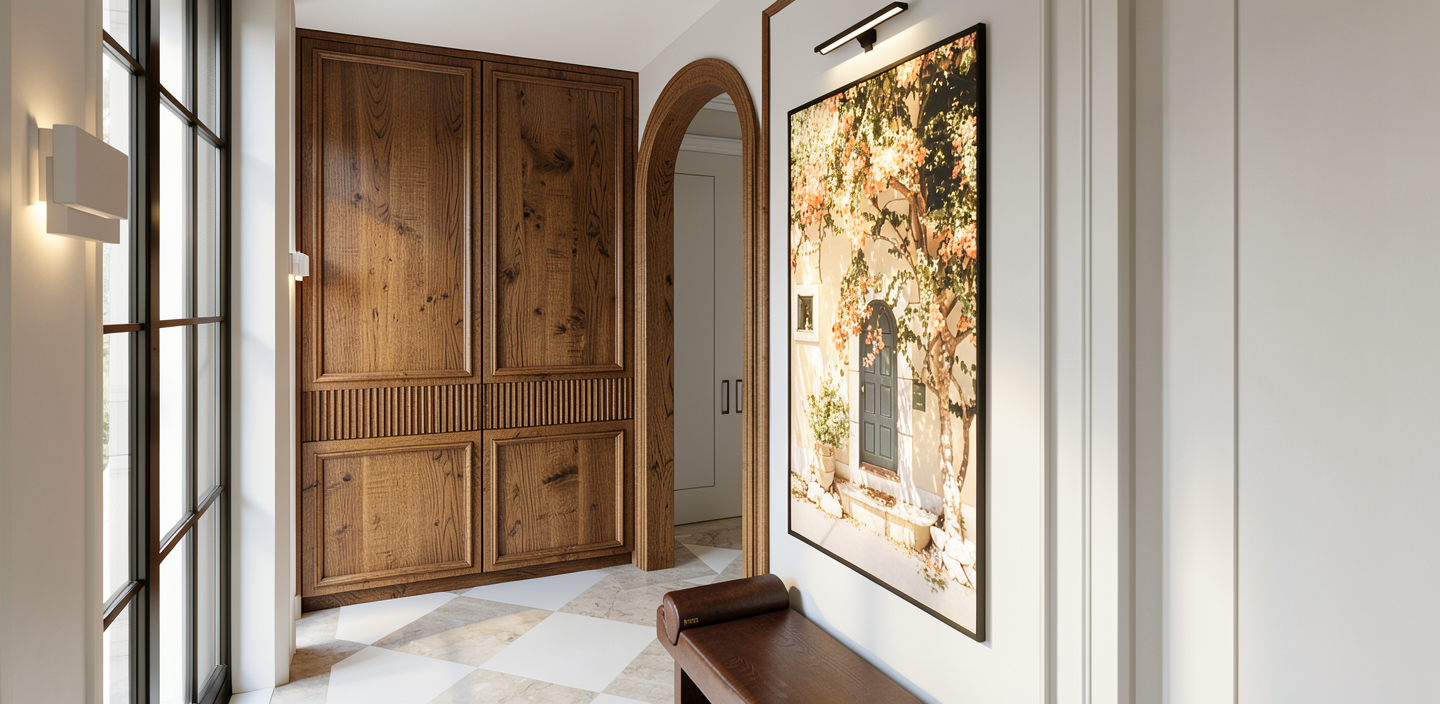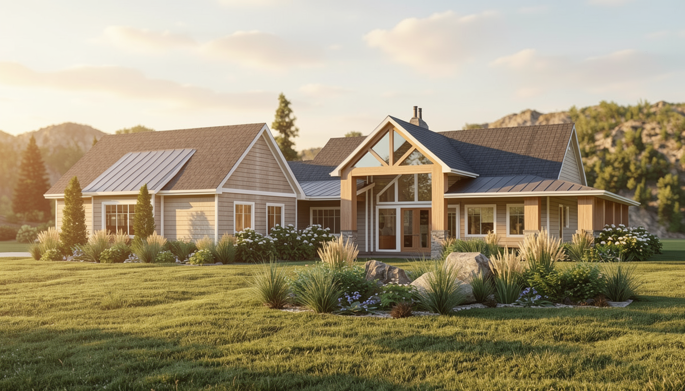 early 20th century english arts and crafts house set within a mature south london garden at night white rendered fa ade with exposed red brick plinth clay tiled hipped roof and central chimney timber multi pane sash windows with black painted shutters traditional eaves with exposed sprockets and a brick entrance porch with fluted pilasters the historic front elevation remains intact at the rear a contemporary extension composed of warm natural timber cladding dark metal panels and large floor to ceiling glazing with slim black aluminium frames on the left side of the image a clear two tier stepped roof structure defines the extension with layered flat roofs and glazed volumes below a lower ground floor garden extension with recessed glazing opens onto timber terraces set within a lush english garden with mature trees lawns and mixed perennial planting warm interior lighting glowing through glass soft landscape lighting across planting and terraces calm atmospheric evening setting refined english residential architecture realistic architectural visualisation