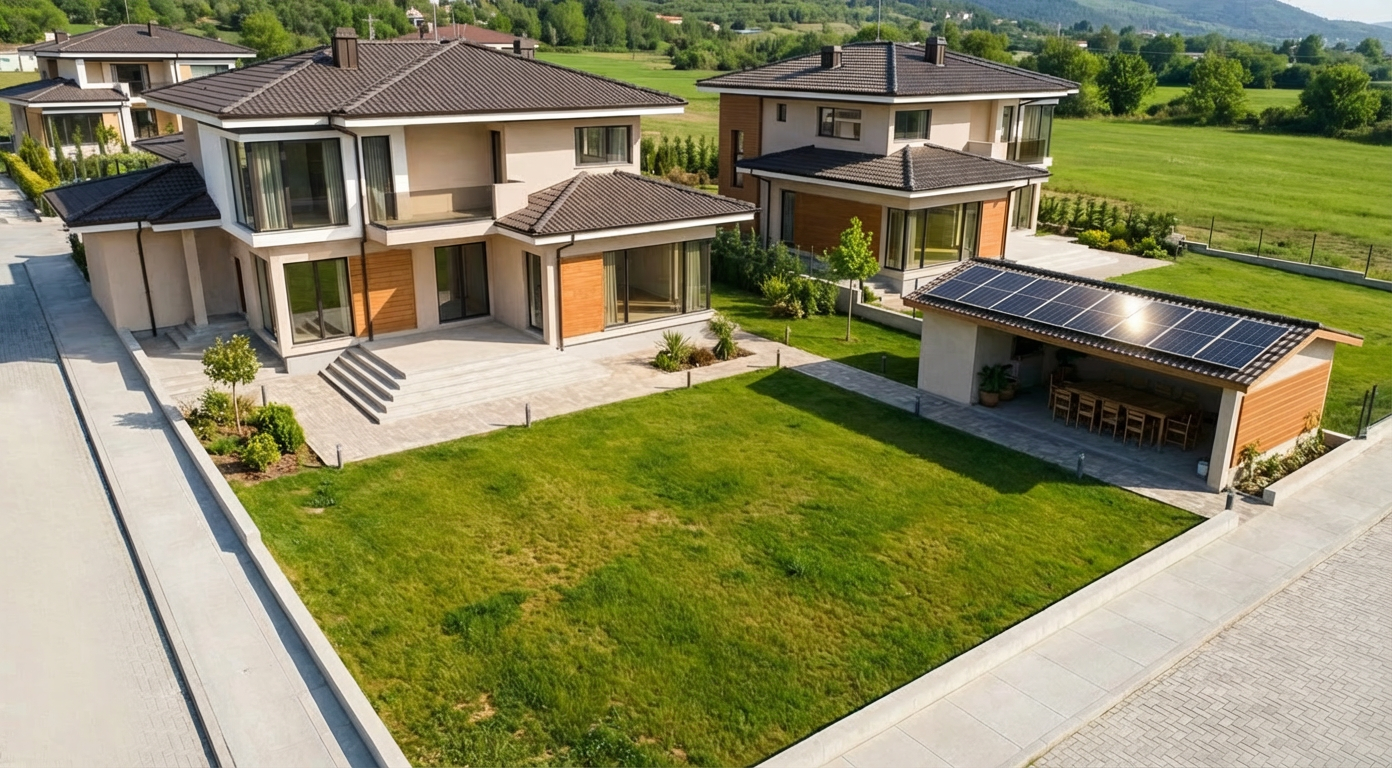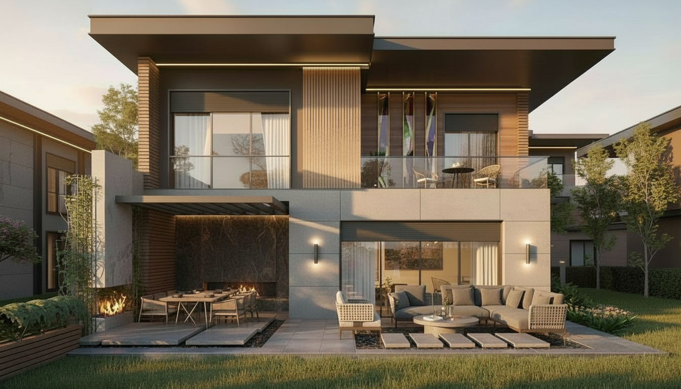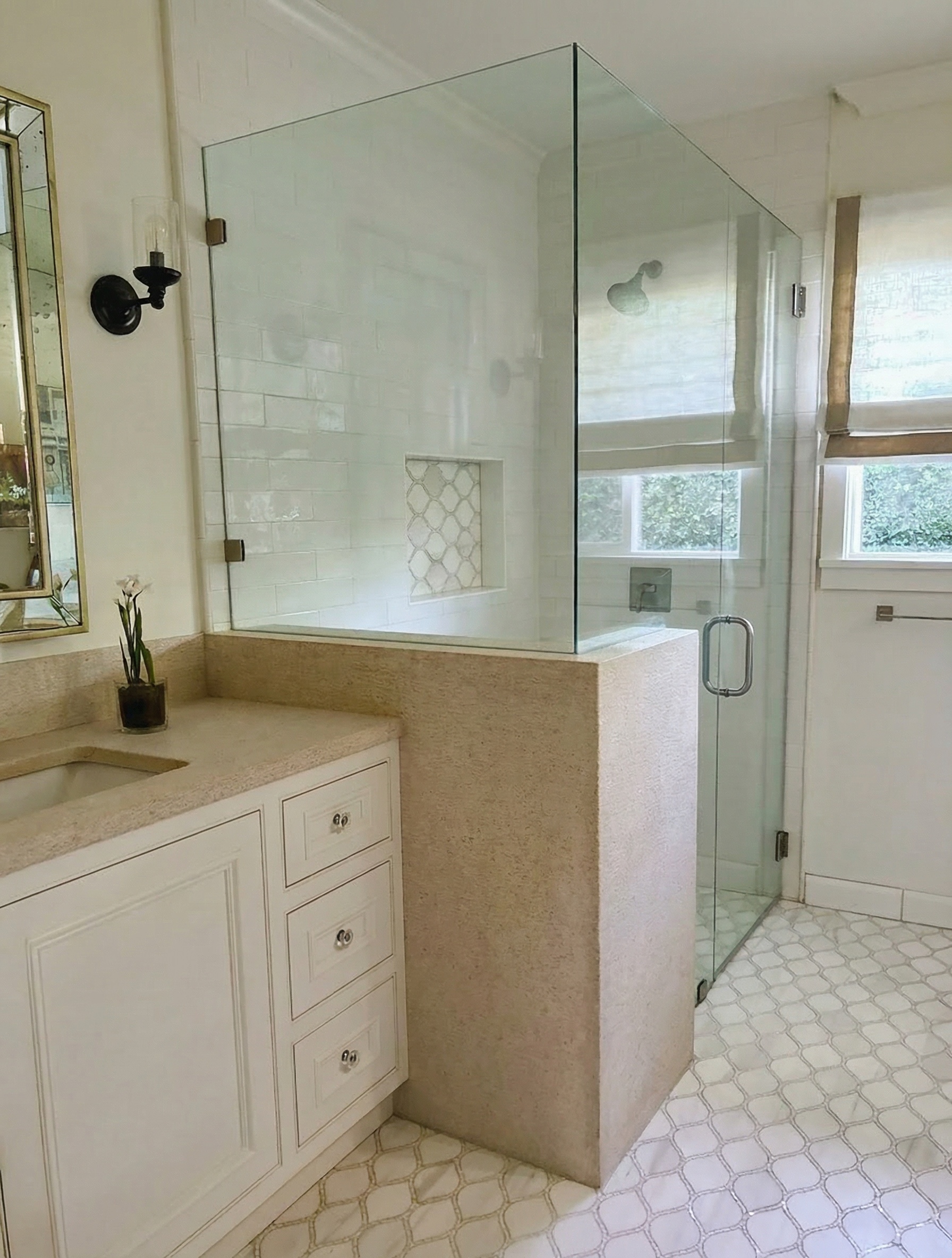 remove the crown molding entirely along the entire ceiling line and blend the wall surface smoothly into the ceiling plane the transition should look like a clean simple junction with no molding profile straighten all verticals so the frameless glass shower enclosure is perfectly plumb cool and neutralize the white balance brighten the white cabinetry slightly to increase contrast between the cabinet faces and the stone countertop without blowing out to pure white remove the small dark plant on the countertop and clone the counter surface cleanly do not simulate or add any artificial lighting natural light only throughout preserve the transparency and depth of the frameless glass enclosure keep the arabesque floor tile sharp and true to color keep the niche accent tile visible through the glass final image should be crisp bright and editorially clean consistent in color temperature and tone with a naturally lit luxury residential bathroom shoot