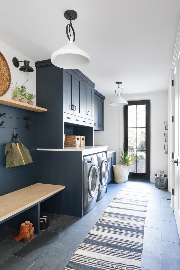 warmer tone and finishes make the room look longer washer and dryer closer to the front wall